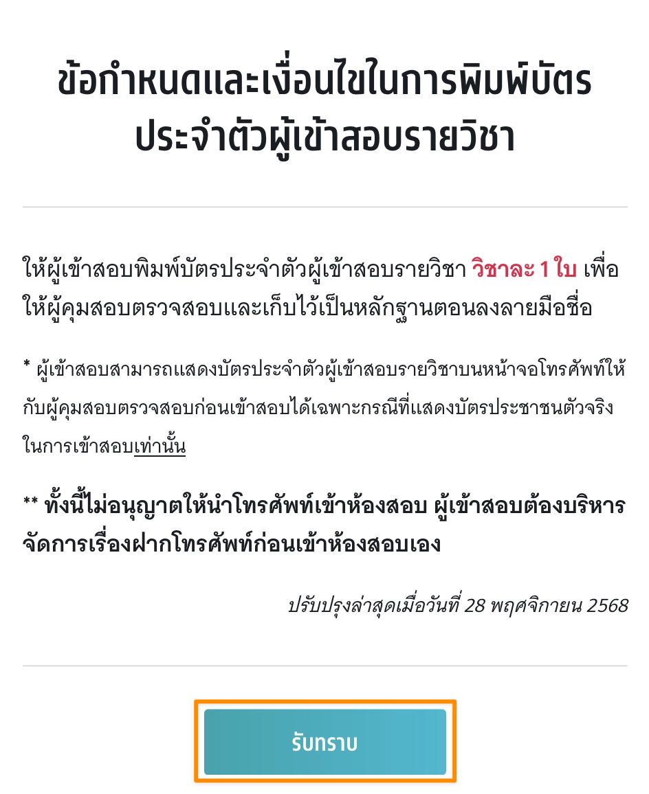 ระบบแสดง ข้อกำหนดและเงื่อนไขในการพิมพ์บัตรประจำตัวผู้เข้าสอบรายวิชา ผู้สมัครสอบอ่านรายละเอียดให้เข้าใจ จากนั้นเลือก “รับทราบ”