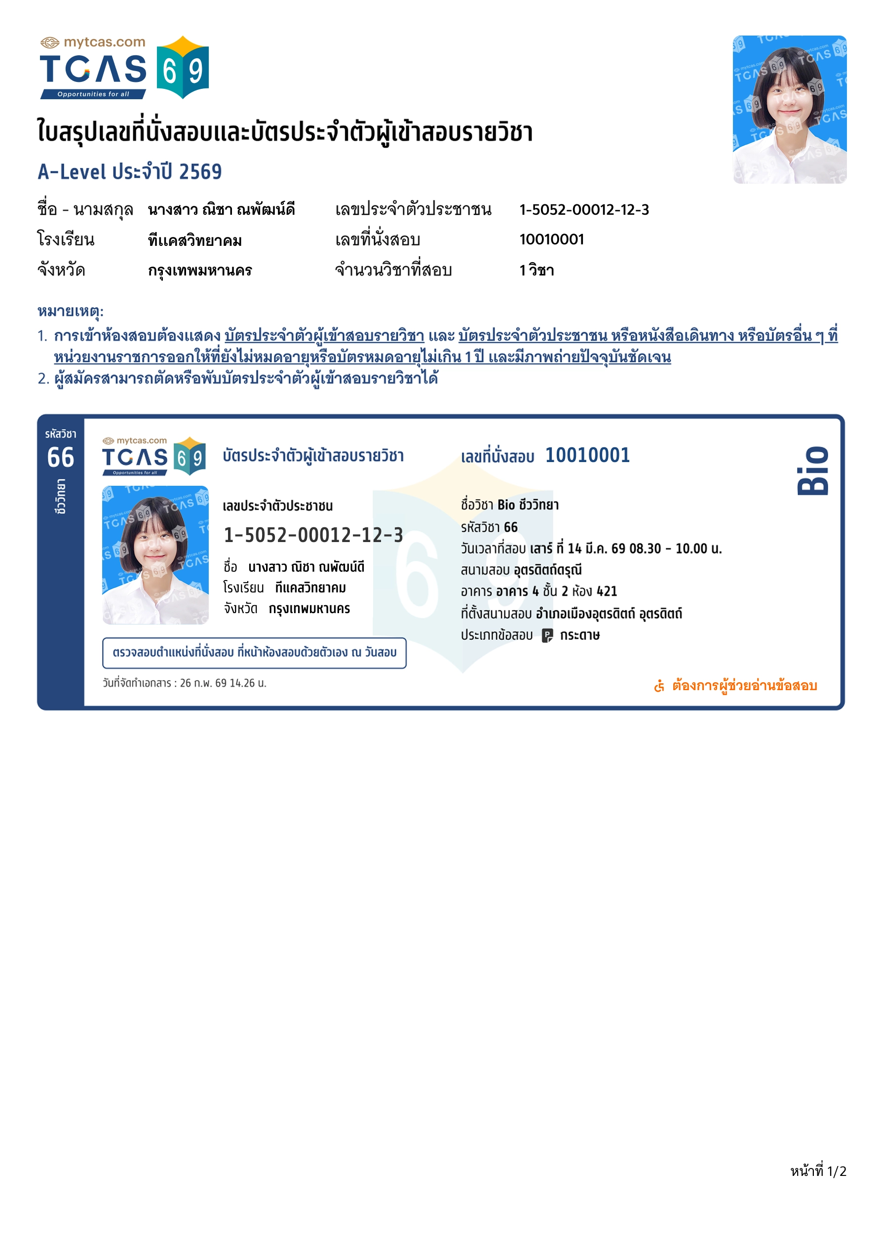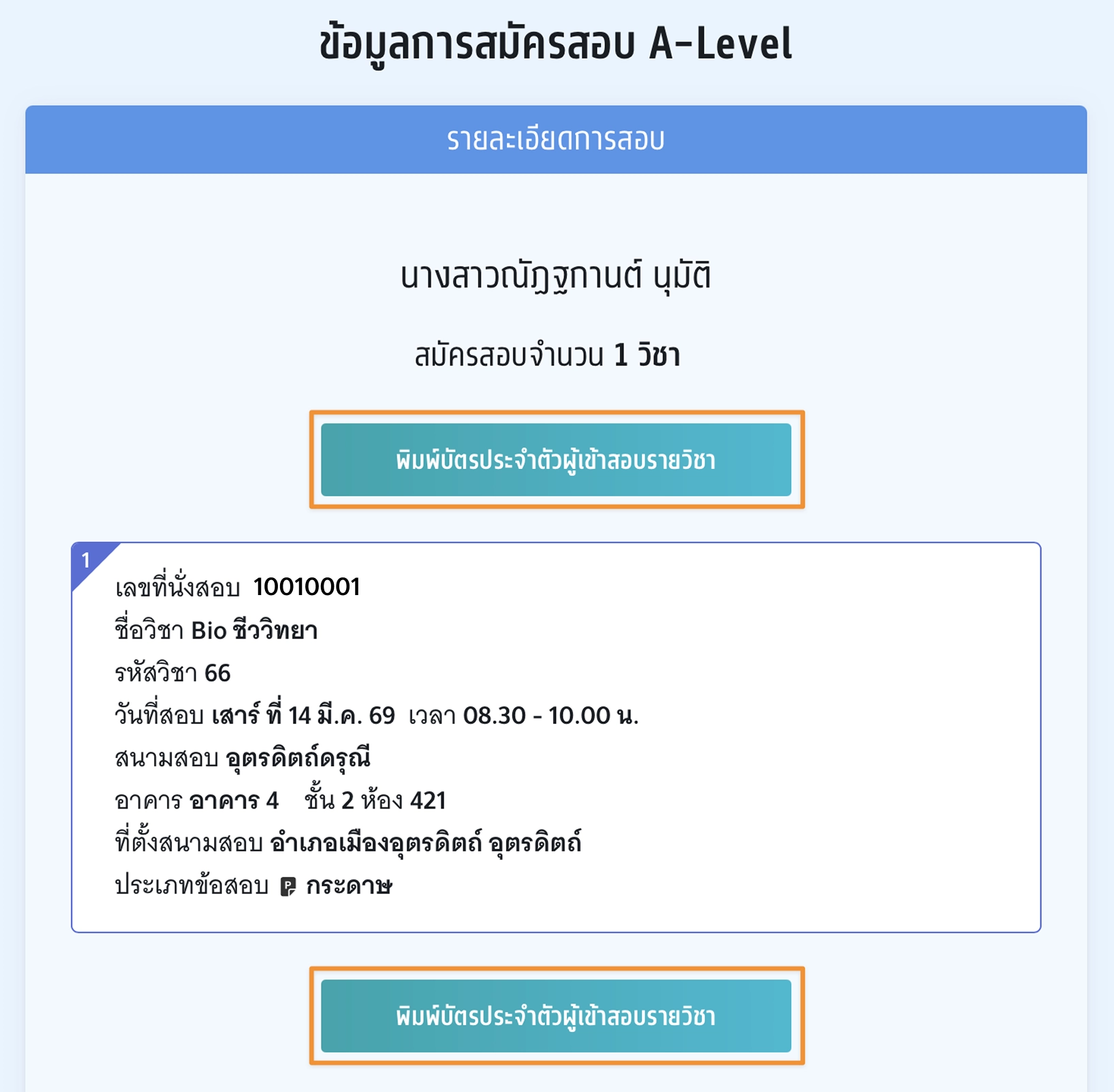 ตัวอย่าง ใบสรุปเลขที่นั่งสอบและบัตรประจำตัวผู้เข้าสอบรายวิชา A-Level ประจำ ปี 2569