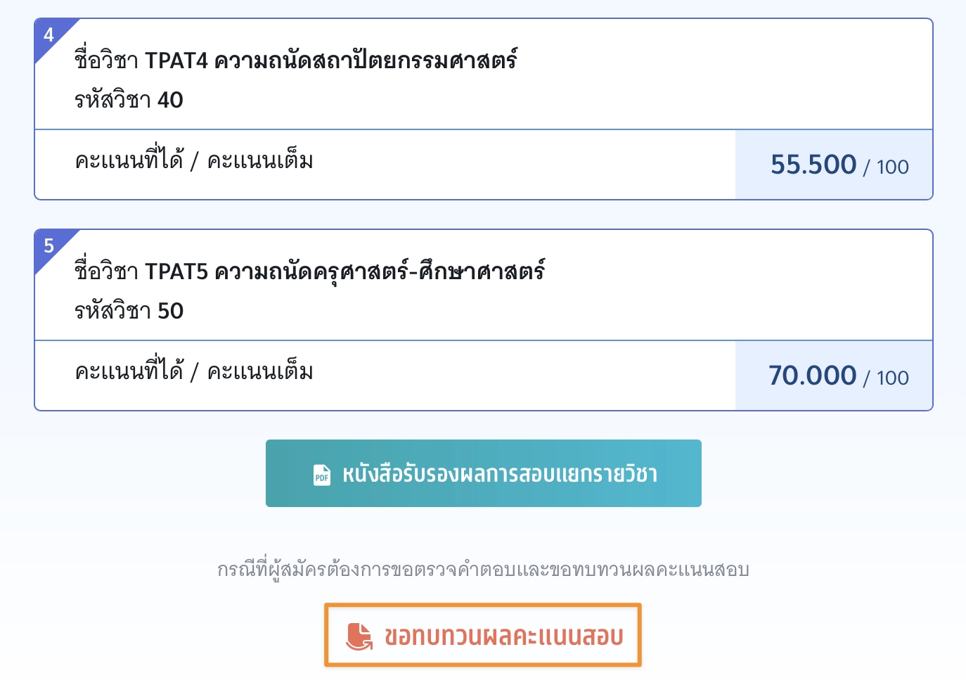 ระบบจะแสดงรายละเอียดผลสอบ TGAT/TPAT2-5 ทั้งหมด ซึ่งผู้สมัครสามารถเลือก “หนังสือรับรองผลการสอบแยกรายวิชา” เพื่อดาวน์โหลดเอกสารหนังสือรับรองผลการสอบแยกรายวิชา