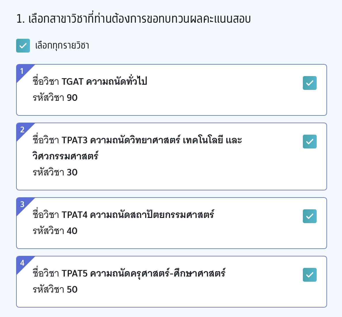 เลือกสาขาวิชาที่ท่านต้องการขอตรวจสอบกระดาษคำตอบ สามารถเลือกทุกรายวิชา หรือ บางรายวิชาได้ (หากเลือก 3 วิชาที่ต้องการตรวจสอบกระดาษคำตอบ ระบบจะเลือกทั้งหมดให้)