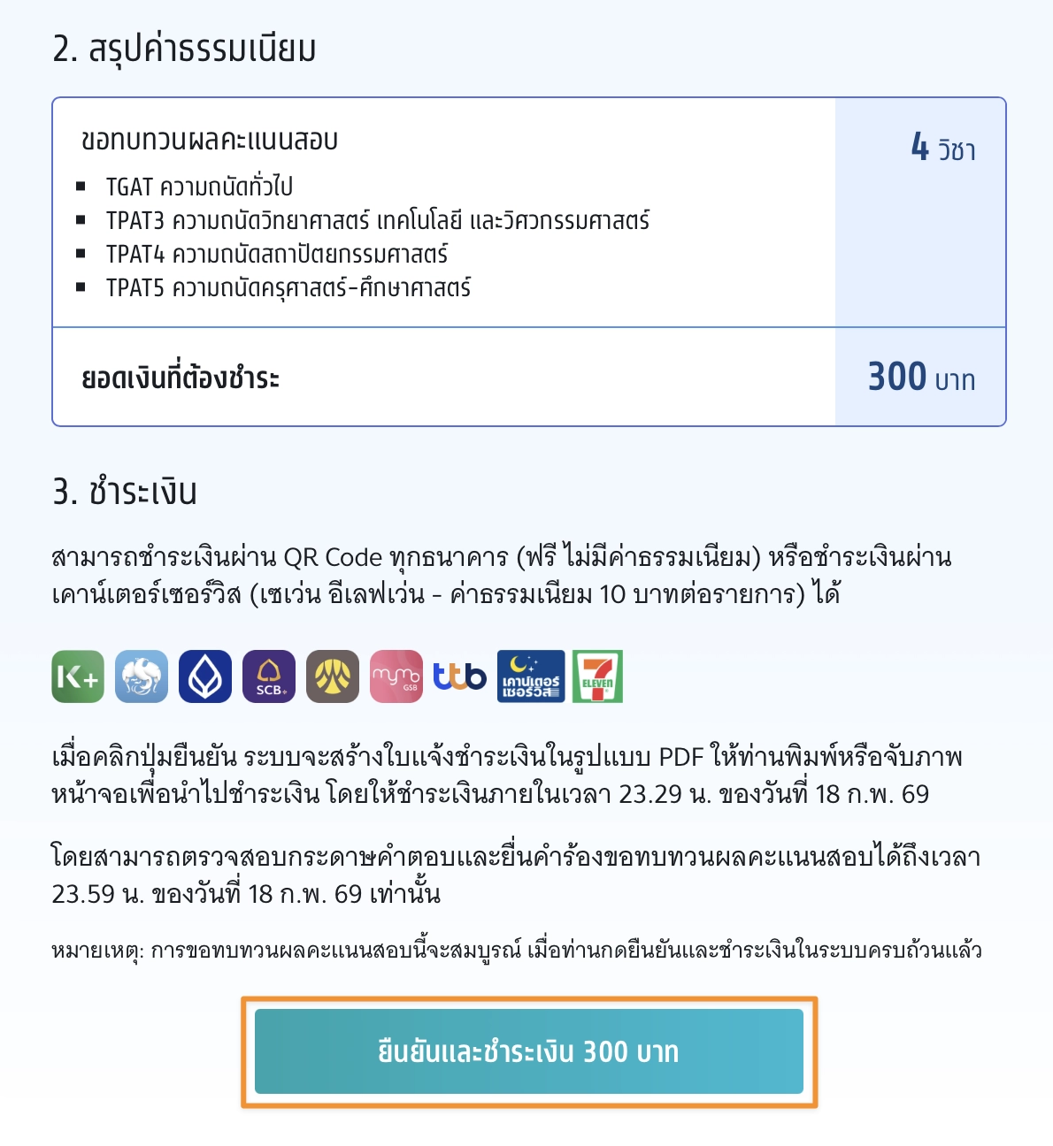 ผู้สมัครสามารถชำระเงินผ่าน QR Code ทุกธนาคารฟรีไม่มีค่าธรรมเนียมหรือพิมพ์ใบแจ้งชำระเงินการขอทบทวนผลคะแนนสอบแล้วนำไปชำระเงินที่เคาน์เตอร์เซอร์วิส (เซเว่น อีเลฟเว่น) ได้ทุกสาขา โดยมีค่าธรรมเนียม 10 บาทต่อรายการ