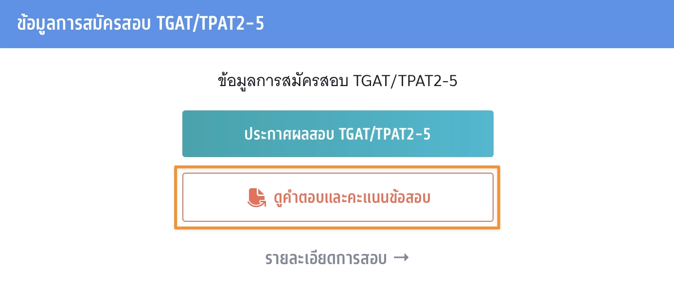 ผู้สมัครสอบเข้าสู่ระบบที่ URL https://student.mytcas.com ระบบแสดงข้อมูลสมัครสอบ TGAT/TPAT2-5 เลือก “รายละเอียดการสอบ”