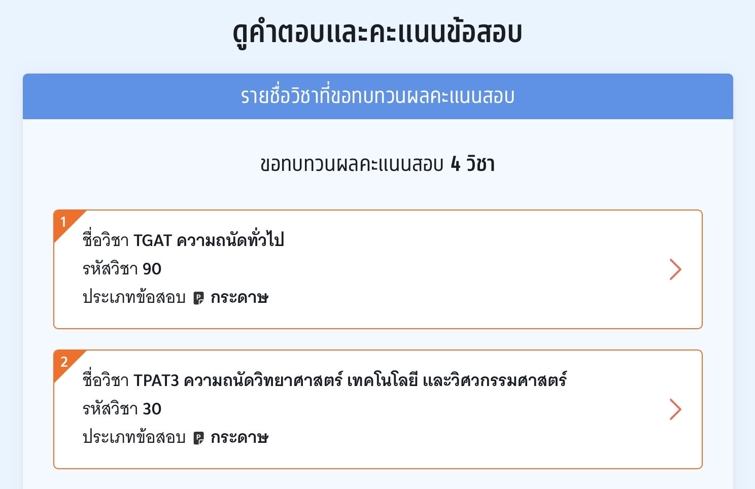 ระบบจะแสดงรายละเอียดผลสอบ TGAT/TPAT2-5 แบบคอมพิวเตอร์ทั้งหมด ซึ่งผู้สมัครสามารถเลือก “หนังสือรับรองผลการสอบแยกรายวิชา” เพื่อดาวน์โหลดเอกสารหนังสือรับรองผลการสอบแยกรายวิชา