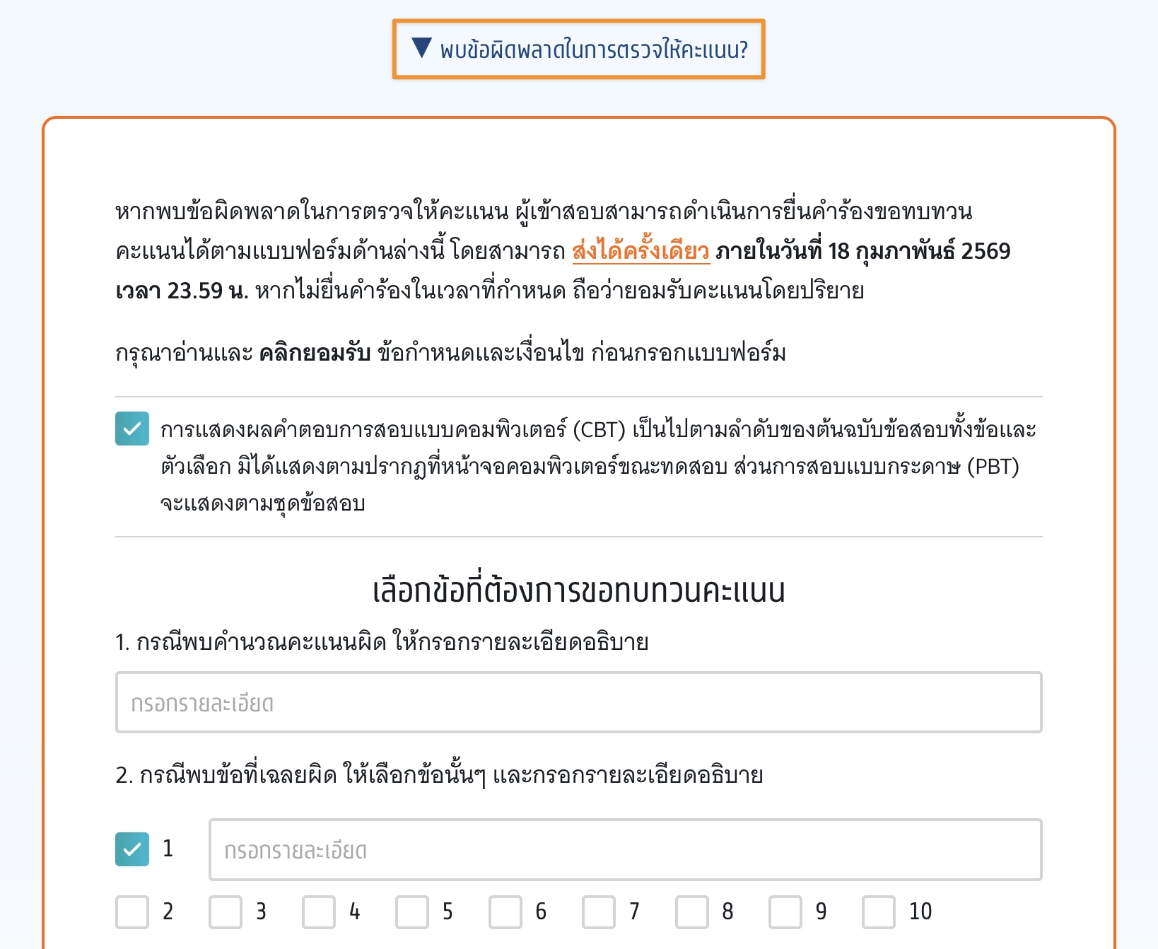 หากพบข้อผิดพลาดในการตรวจให้คะแนน ผู้เข้าสอบสามารถดำเนินการยื่นคำร้องขอทบทวนคะแนนได้ตามแบบฟอร์มด้านล่างนี้ โดยสามารถ ส่งได้ครั้งเดียว ภายในวันที่ 18 กุมภาพันธ์ 2569 เวลา 23.59 น. หากไม่ยื่นคำร้องในเวลาที่กำหนด ถือว่ายอมรับคะแนนโดยปริยาย
