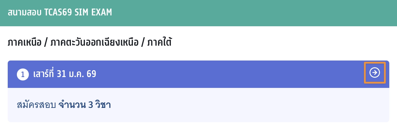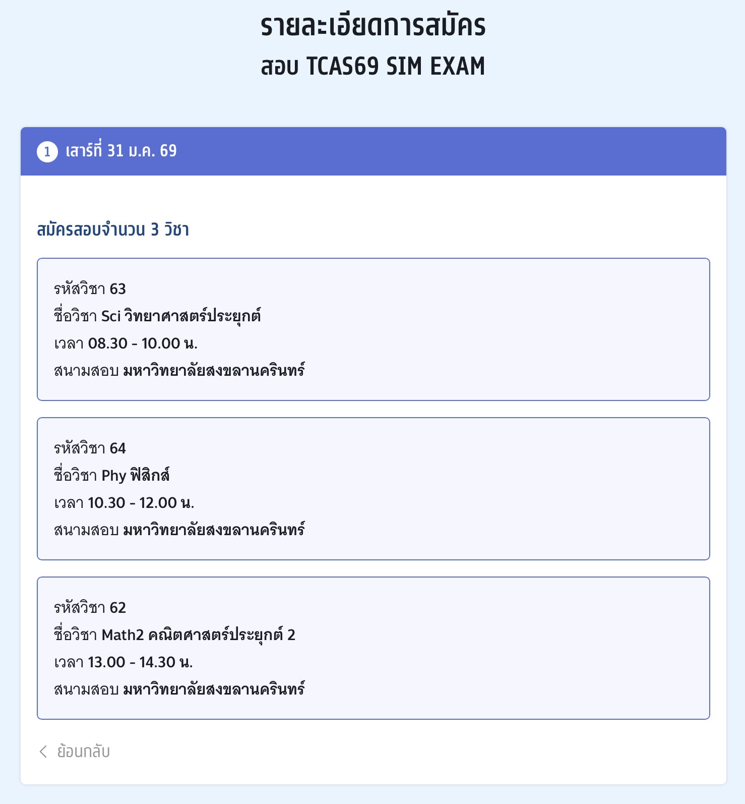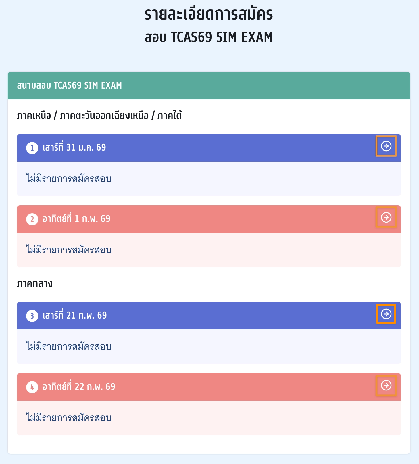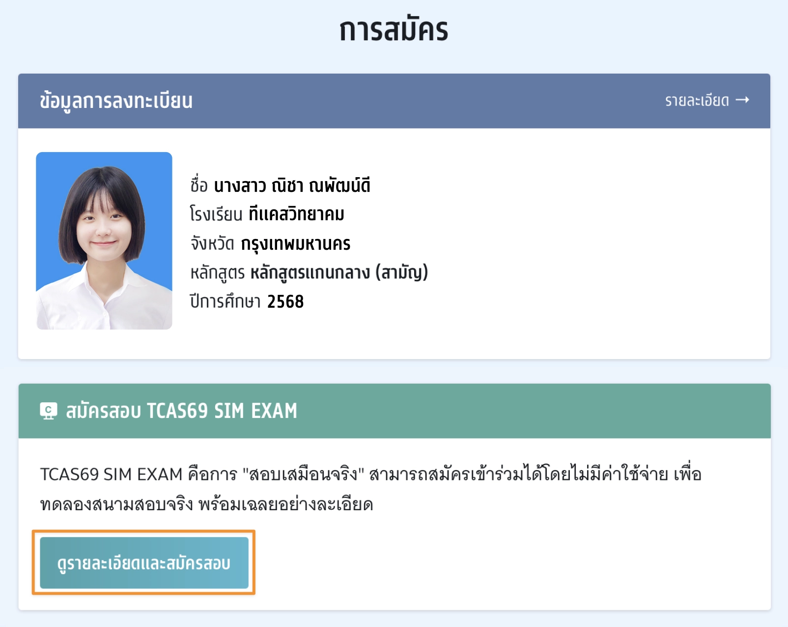 ผู้สมัครเข้าสู่ระบบที่ URL https://student.mytcas.com ในหน้าของการสมัครสอบ TCAS69 SIM EXAM เลือก “ดูรายละเอียดและสมัครสอบ”