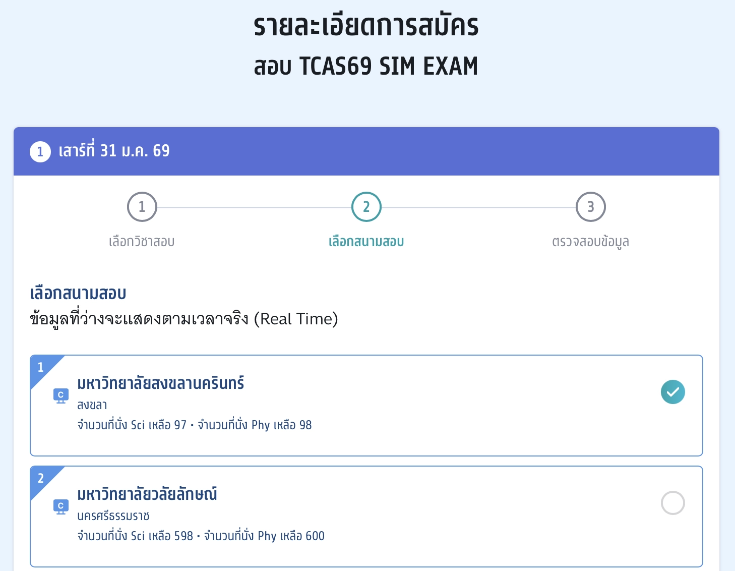 ข้อมูลจำนวนที่นั่งว่างในสนามสอบจะแสดงตามเวลาจริง (Realtime)