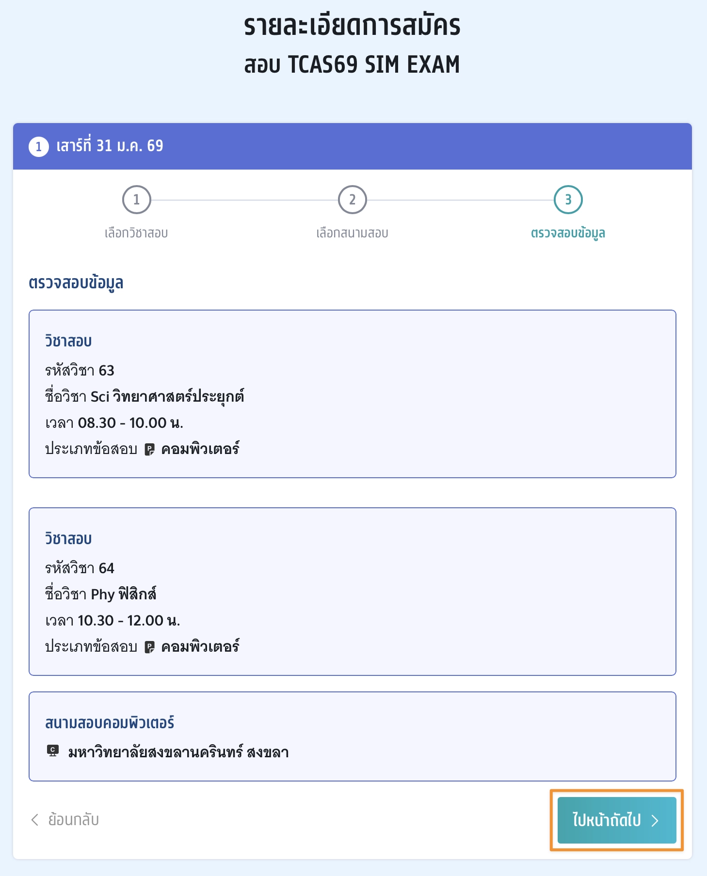 เมื่อทำการเลือกวิชาสอบและสนามสอบเสร็จสิ้นแล้ว ระบบจะปรากฏข้อมูลรายละเอียดการสมัครสอบและสนามสอบ ให้ผู้สมัครตรวจสอบข้อมูลให้ครบถ้วน ก่อนเลือก “ไปหน้าถัดไป”