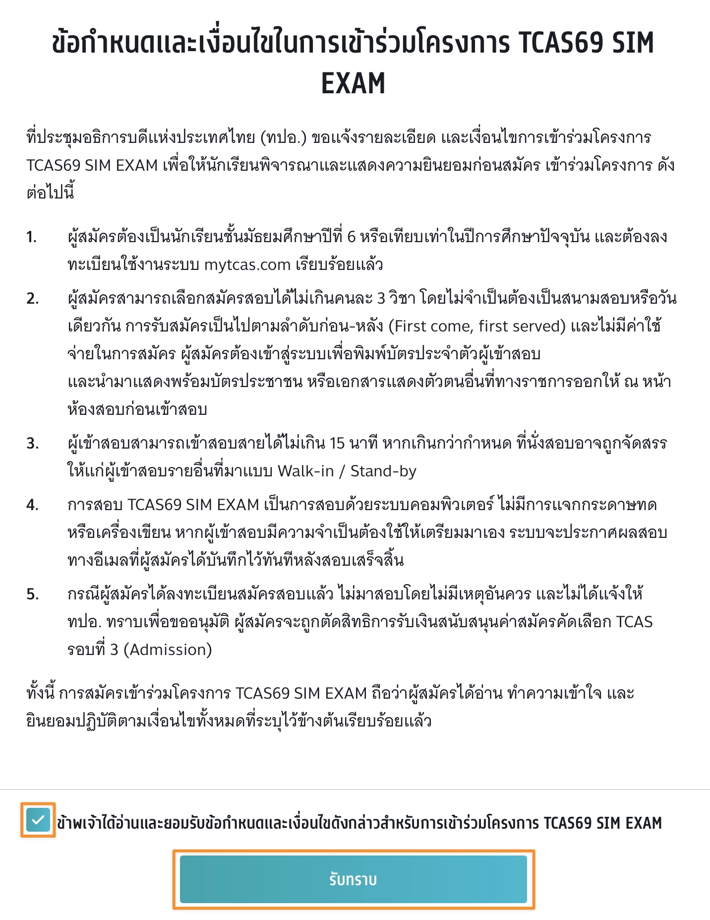ระบบแสดง ข้อกำหนดและเงื่อนไขในการเข้าร่วมโครงการ TCAS69 SIM EXAM กรุณาอ่านและ คลิกยอมรับ ข้อกำหนดและเงื่อนไขทุกข้อ ก่อนคลิก “รับทราบ”