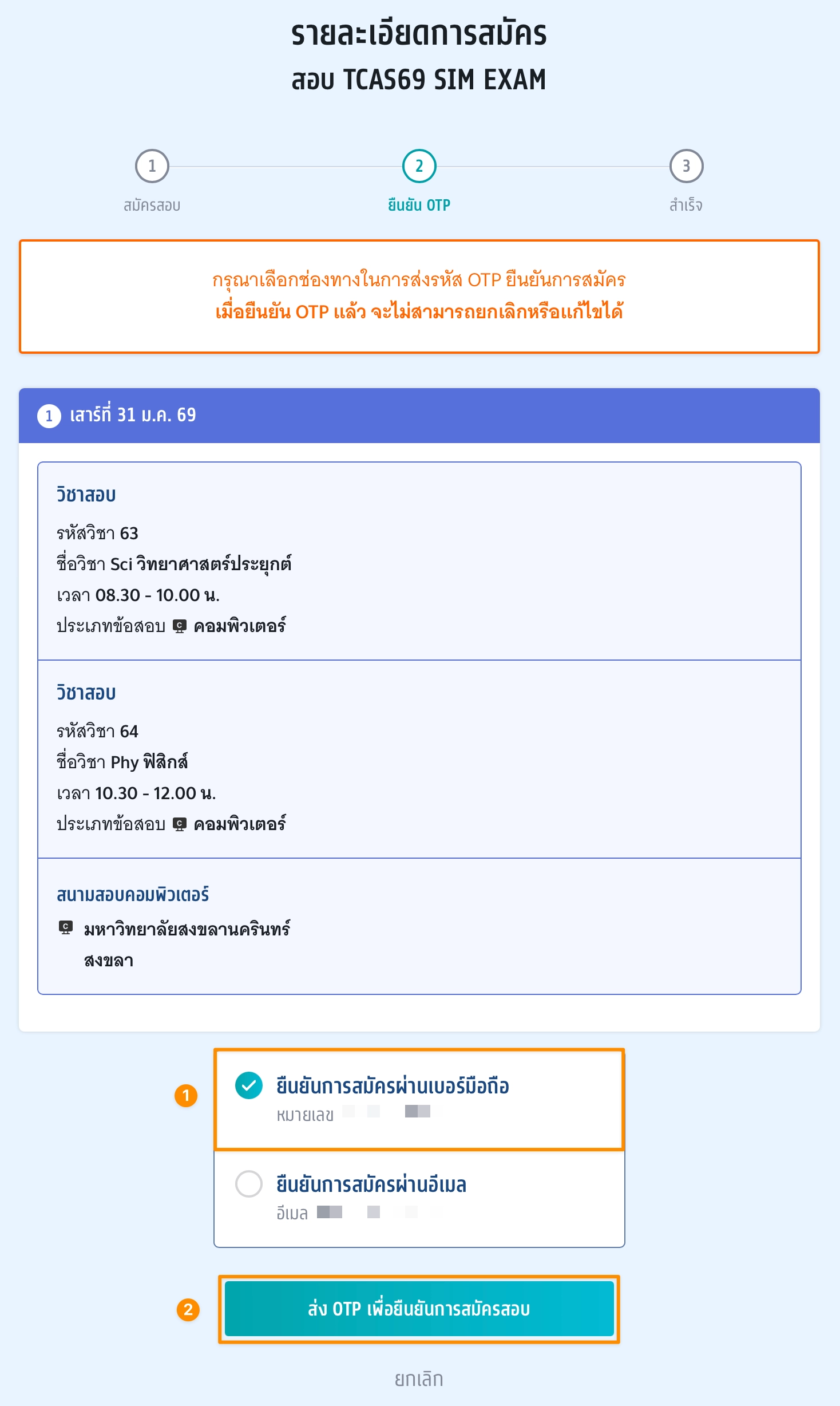 ตรวจสอบความถูกต้องอีกครั้ง และเลือกช่องทางในการส่งรหัส One Time Password (OTP) เพื่อยืนยันการสมัครสอบ จากนั้นเลือก “ส่ง OTP เพื่อยืนยันการสมัครสอบ”