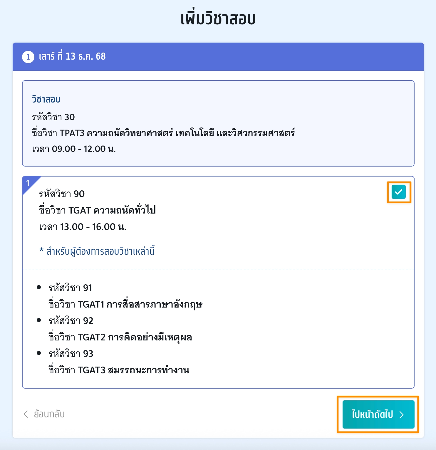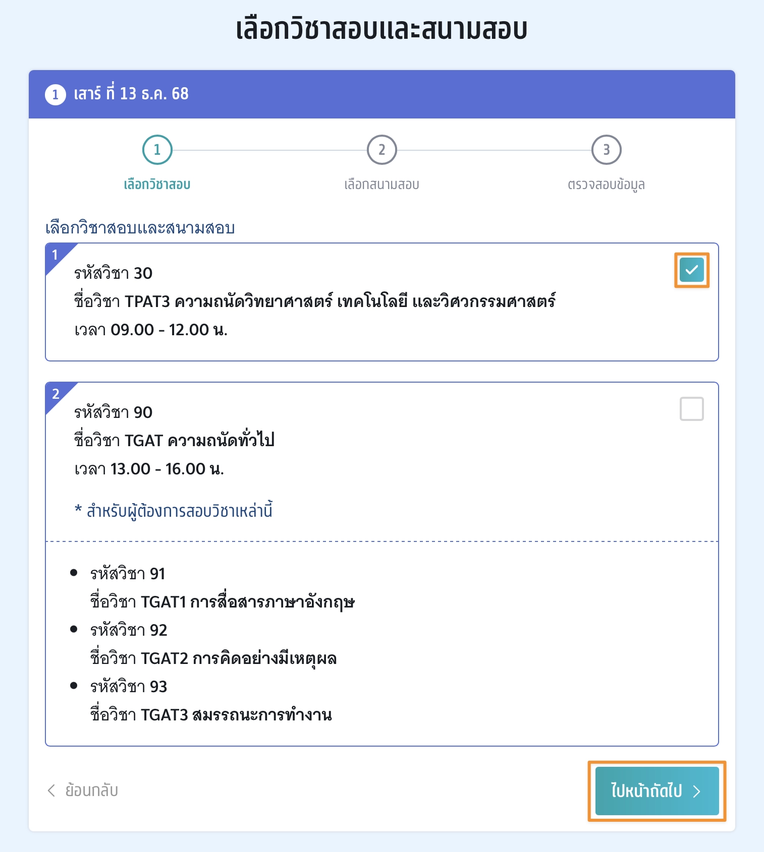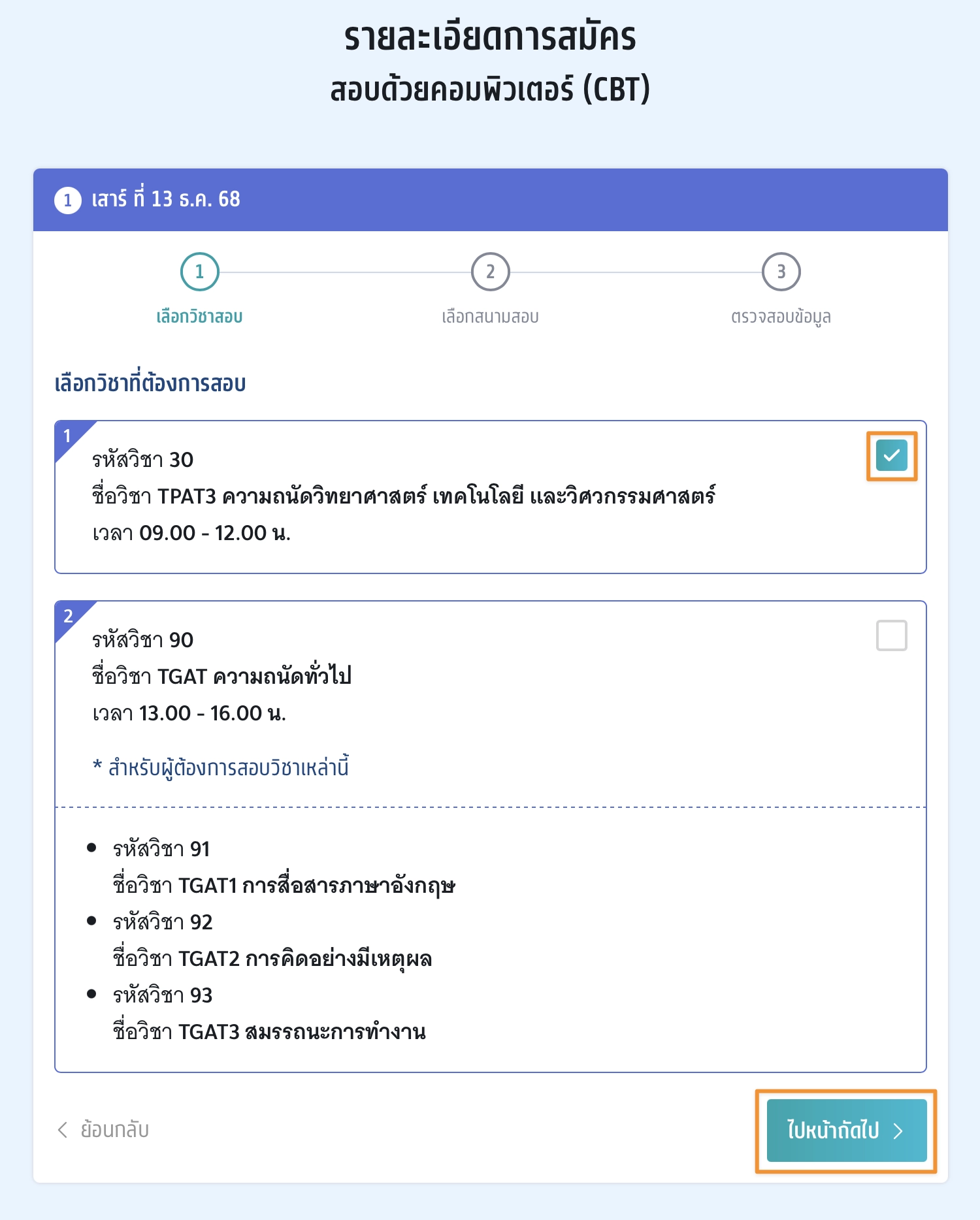 หลังจากนั้นให้ผู้สมัครเลือกวิชาสอบที่ต้องการ แล้วเลือก “ไปหน้าถัดไป”