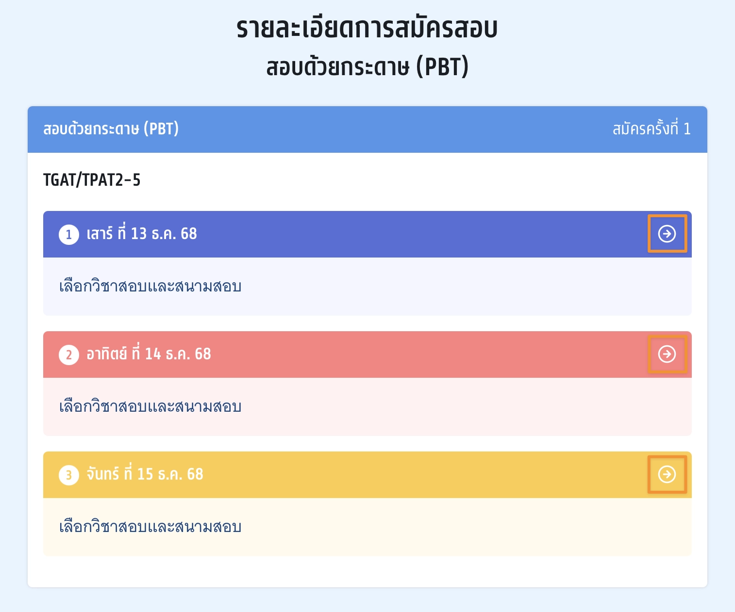 ระบบจะปรากฏวันสอบของแต่ละรายวิชา การเลือกวิชาสอบและสนามสอบให้เลือกเป็นรายวัน ให้ผู้สมัครเลือกวันที่ที่ต้องการสอบ โดยเลือกที่ไอคอนลูกศร