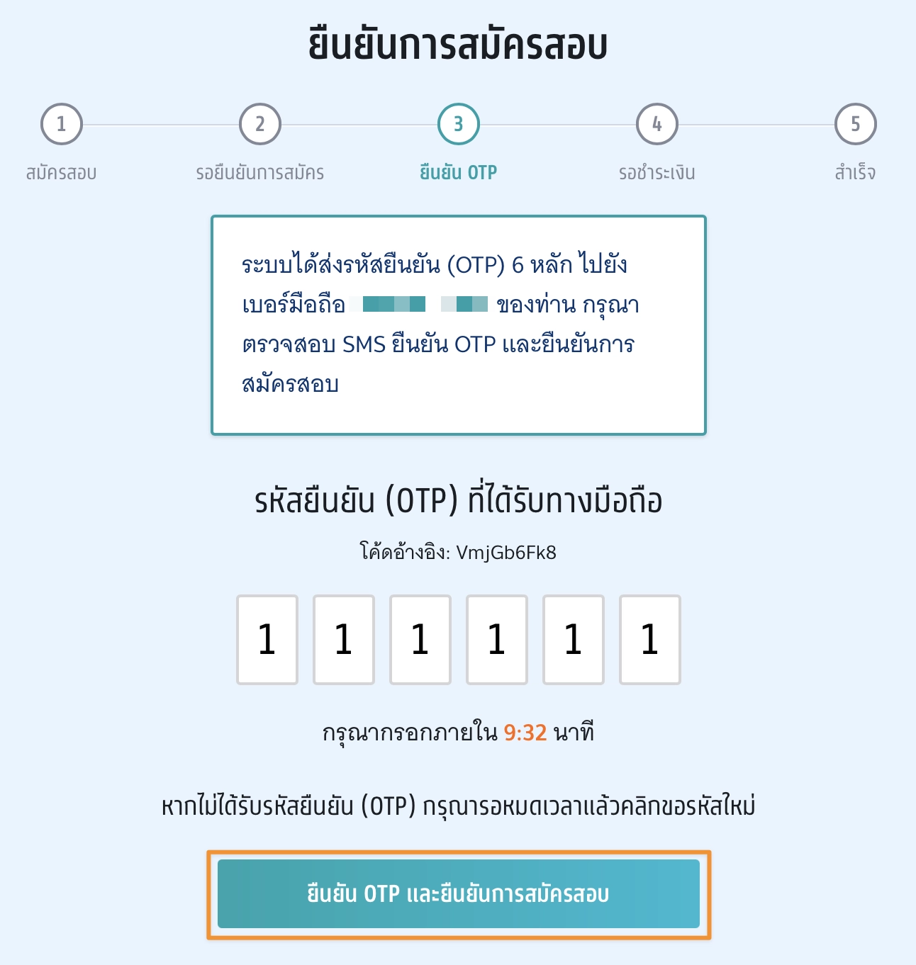 กรอกรหัสยืนยัน One Time Password (OTP) ที่ได้รับ จากนั้นเลือก “ยืนยัน OTP และยืนยันการสมัครสอบ”