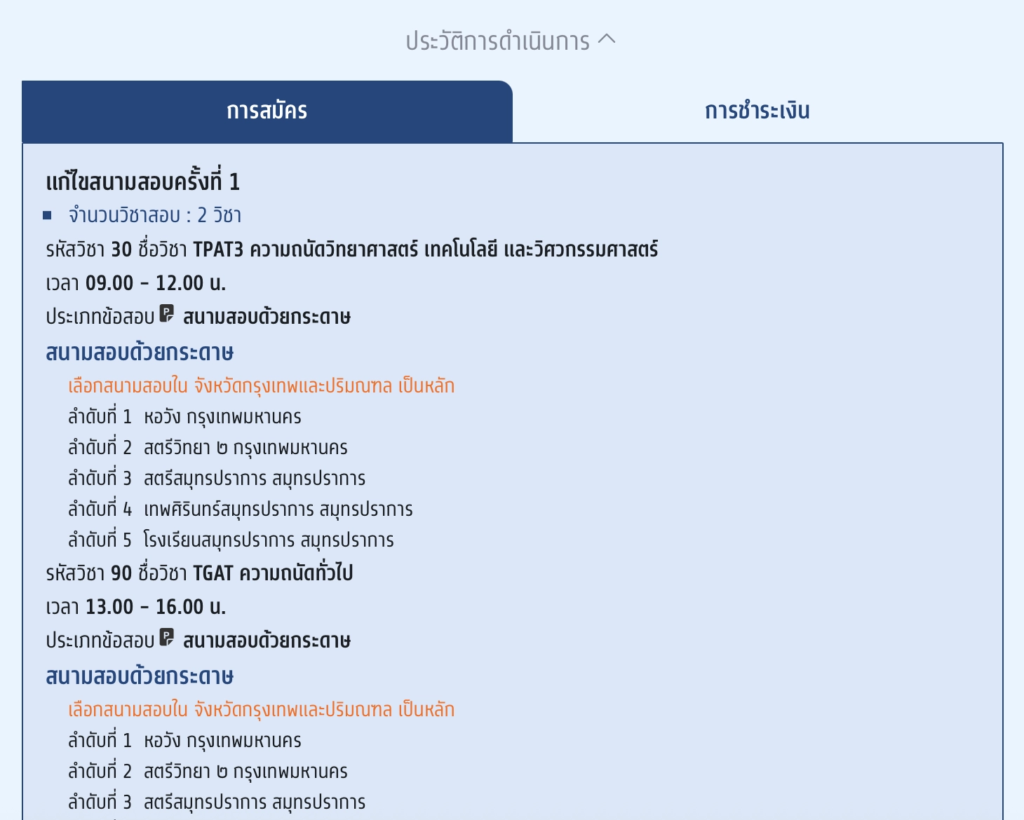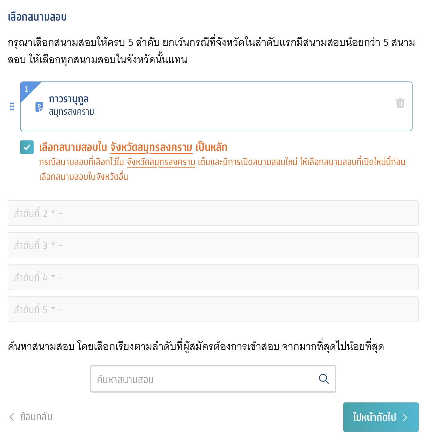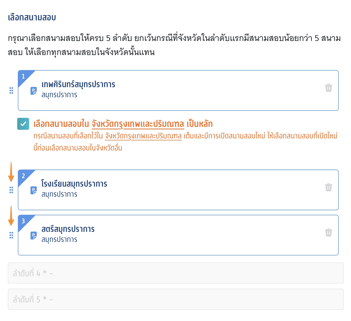 รายละเอียดสนามสอบที่ผู้สมัครเลือกจะปรากฏ ผู้สมัครสามารถเลื่อนจัดลำดับสนามสอบขึ้นหรือลง เพื่อจัดลำดับสนามสอบใหม่ได้