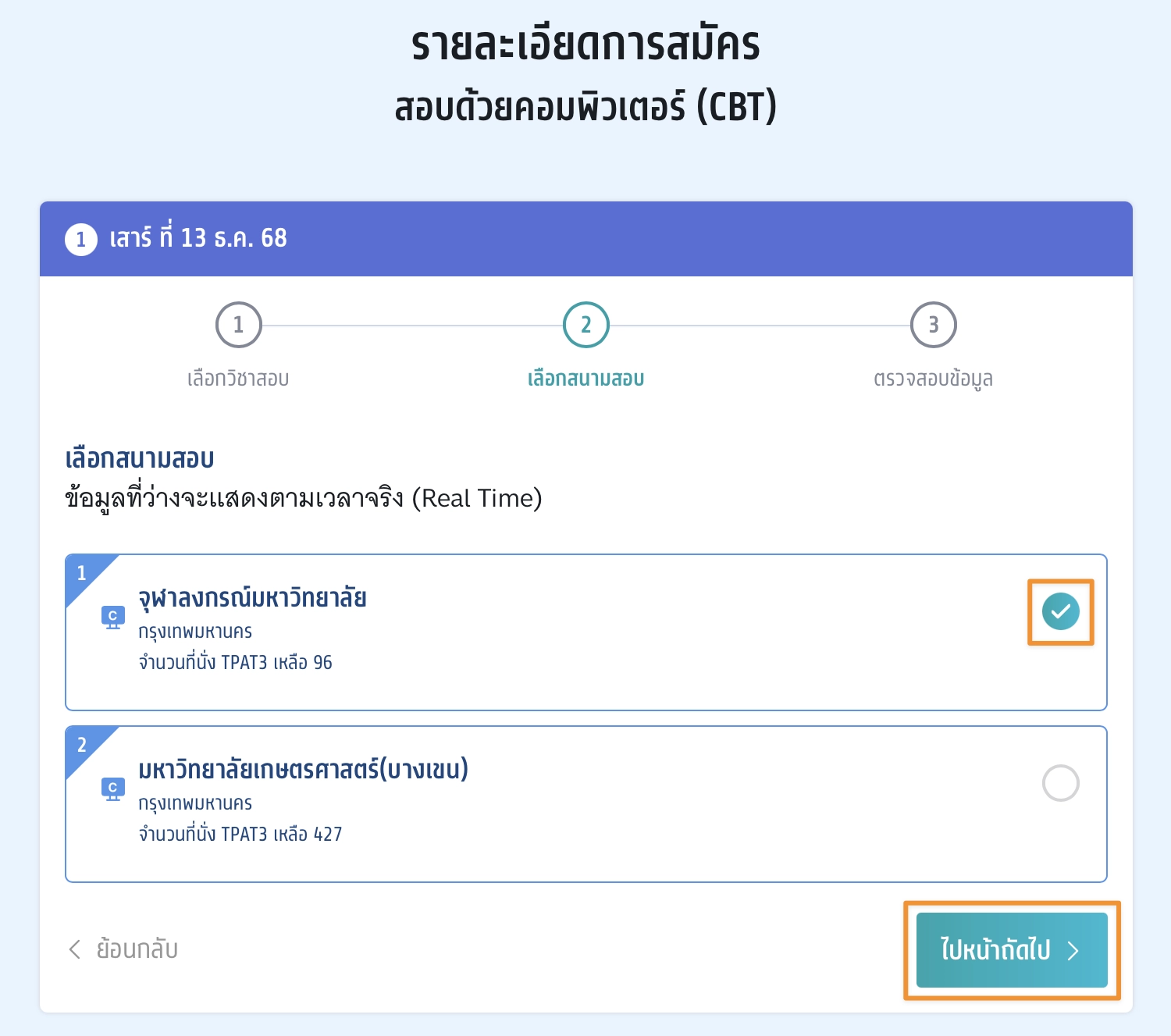 ข้อมูลจำนวนที่นั่งว่างในสนามสอบจะแสดงตามเวลาจริง (Realtime)