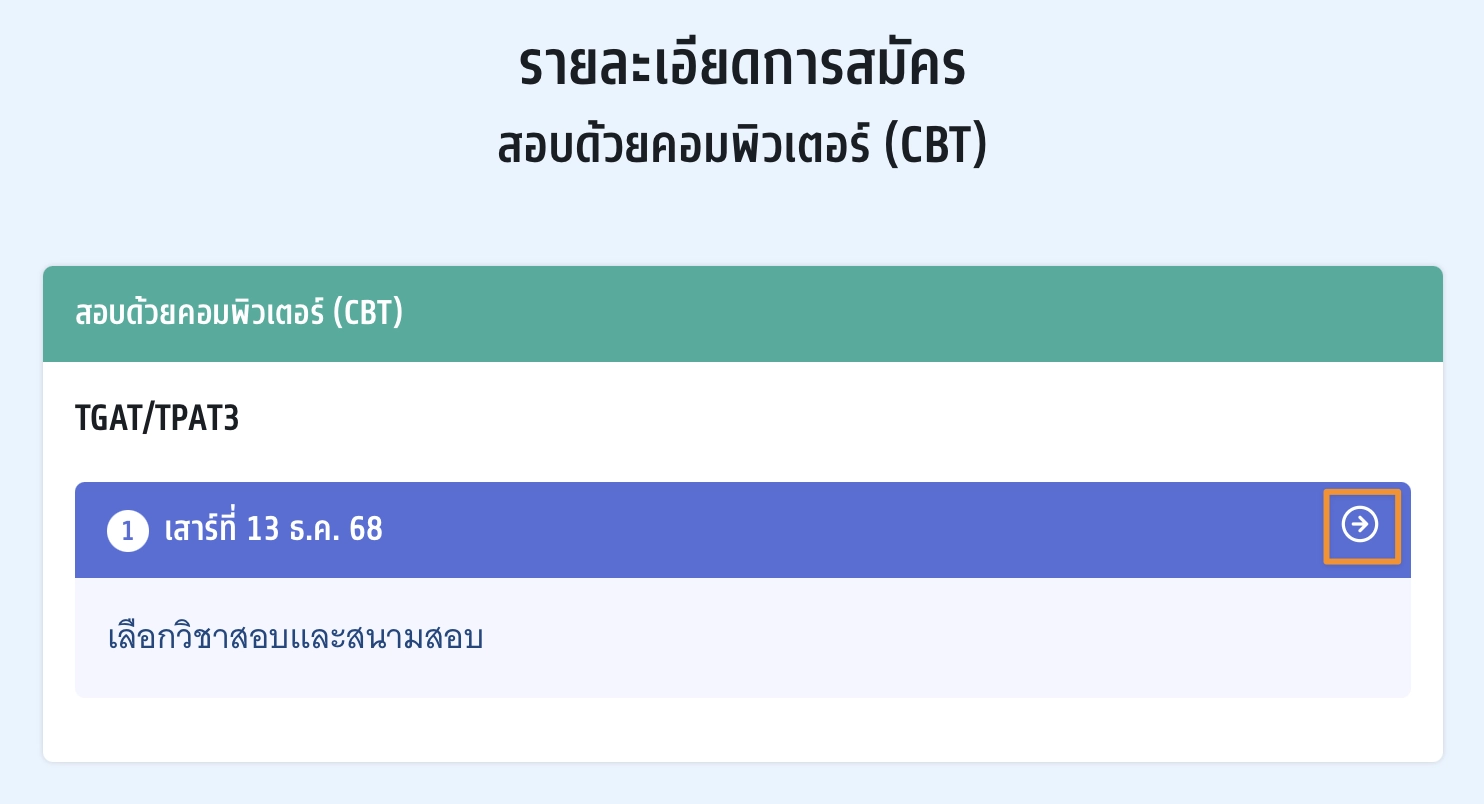 ระบบจะปรากฏวันเวลาสอบให้ผู้สมัครเลือกวันที่ต้องการสอบ โดยเลือกที่ไอคอนลูกศร