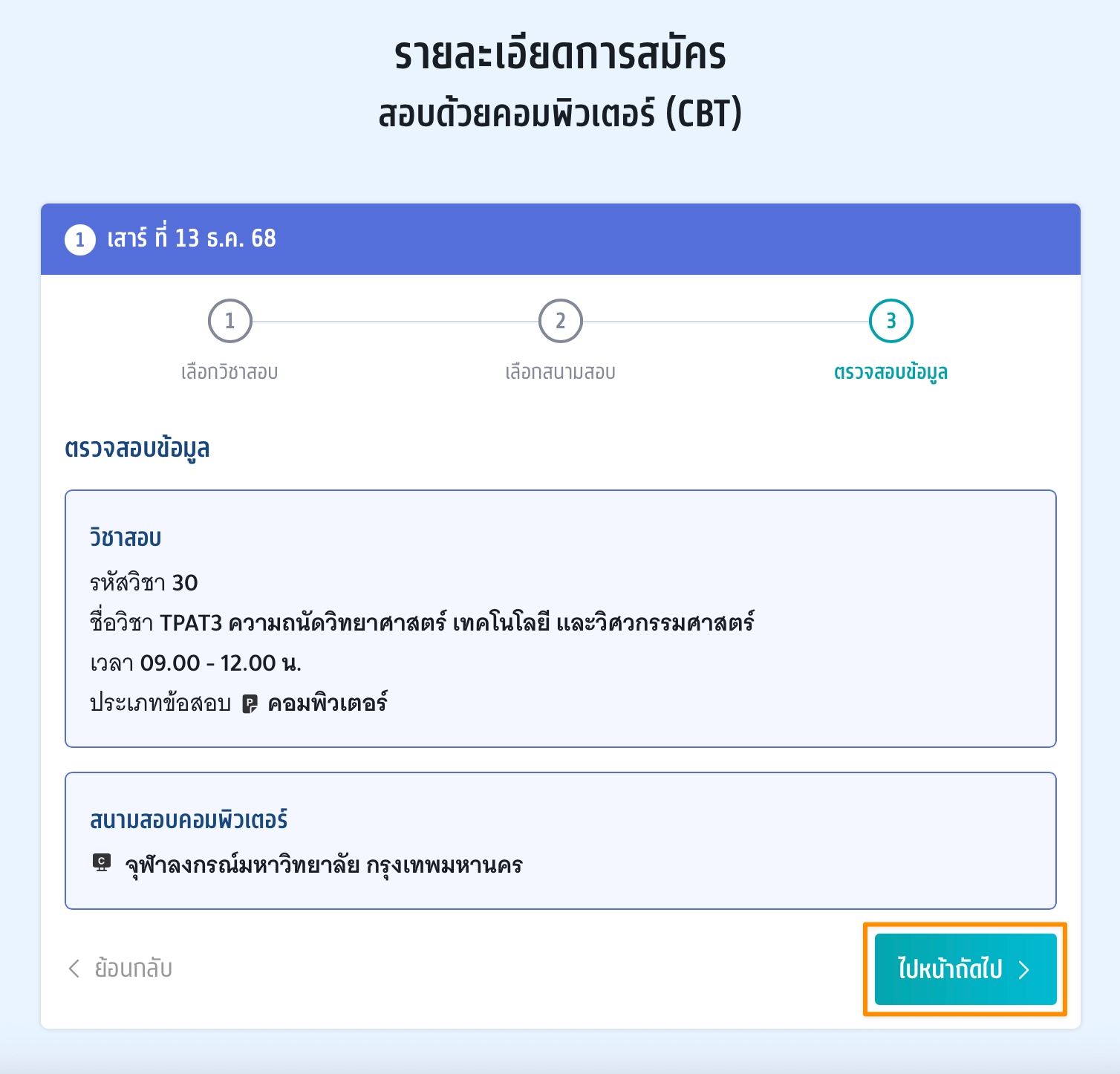 เมื่อทำการเลือกวิชาสอบและสนามสอบเสร็จสิ้นแล้ว ระบบจะปรากฏข้อมูลรายละเอียดการสมัครสอบและสนามสอบ ให้ผู้สมัครตรวจสอบข้อมูลให้ครบถ้วน ก่อนเลือก “ไปหน้าถัดไป”