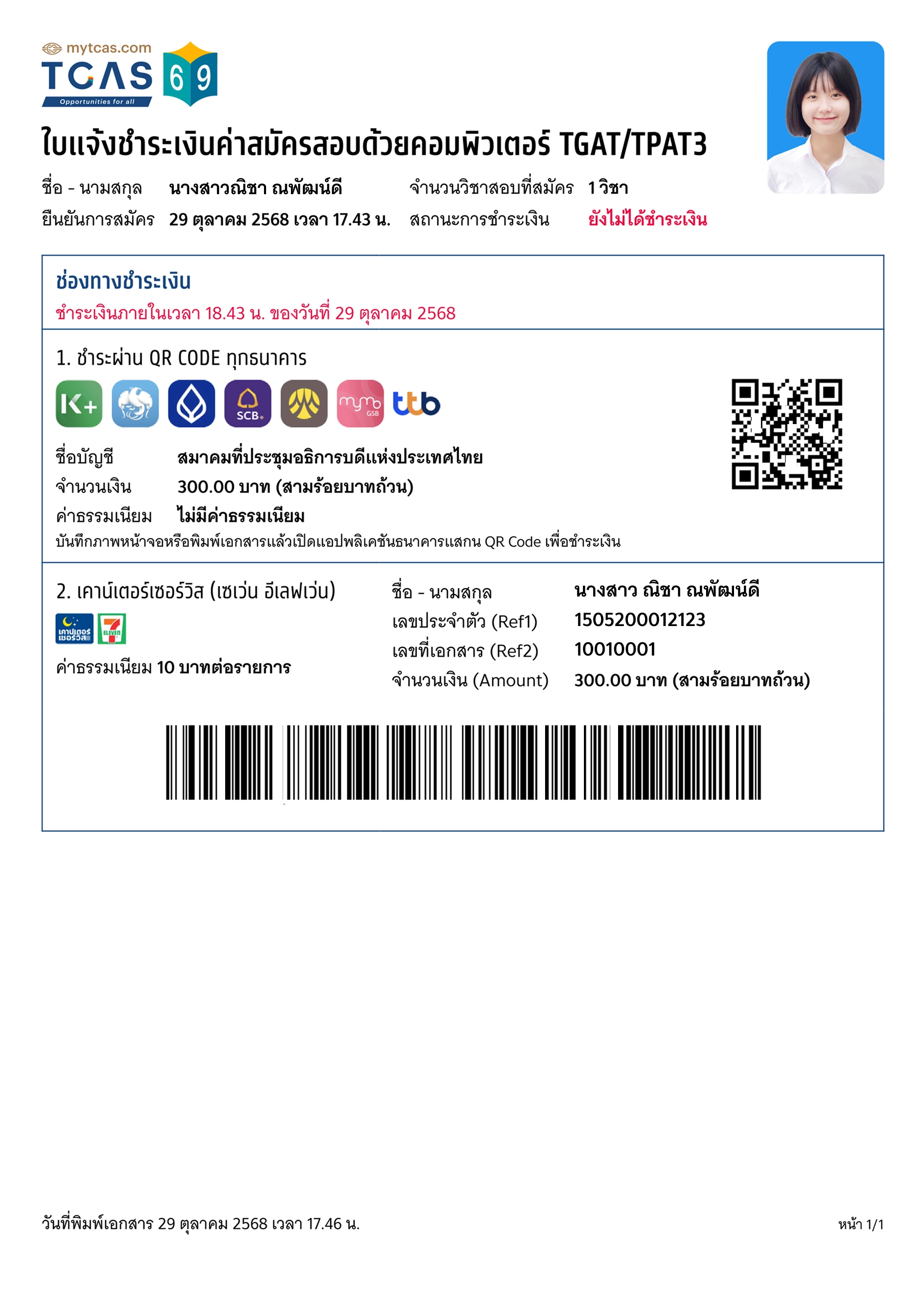 เมื่อทำการพิมพ์ใบแจ้งชำระเงิน ระบบจะปรากฏใบแจ้งชำระเงินค่าสมัครสอบ สถานะการชำระเงิน “ยังไม่ได้ชำระเงิน” ผู้สมัครสามารถชำระเงินผ่าน QR Code ทุกธนาคารฟรีไม่มีค่าธรรมเนียมหรือพิมพ์ใบแจ้งชำระเงินค่าสมัครสอบแล้วนำไปชำระเงินที่เคาน์เตอร์เซอร์วิส (เซเว่น อีเลฟเว่น) ได้ทุกสาขา โดยมีค่าธรรมเนียม 10 บาทต่อรายการ