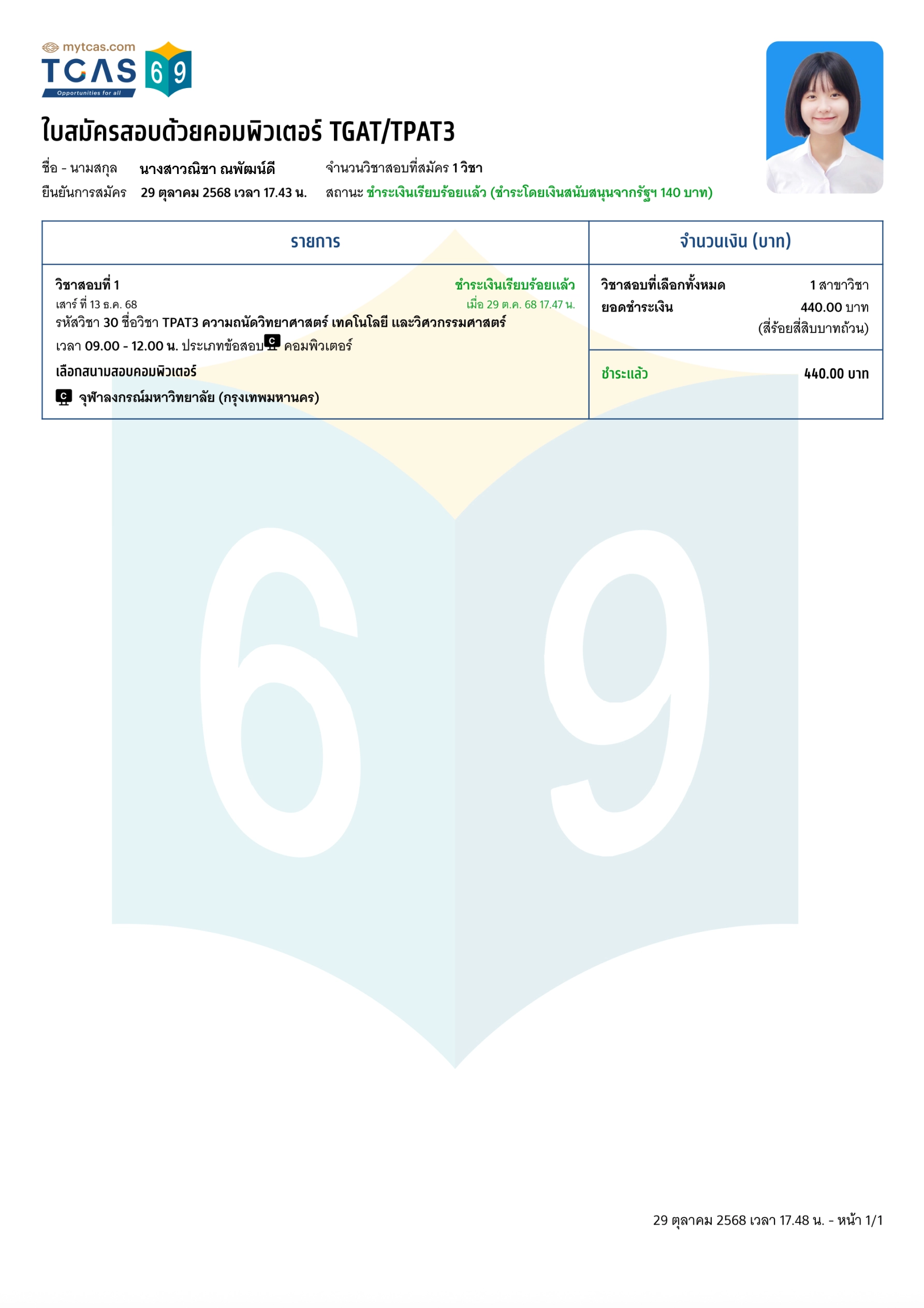 เข้าใช้งานระบบที่ URL https://student.mytcas.com ในหน้าของข้อมูลการสมัครสอบ ผู้สมัครจะต้องทำการเลือกประเภทข้อสอบ โดยเลือกระหว่าง ข้อสอบแบบกระดาษ หรือ ข้อสอบแบบคอมพิวเตอร์