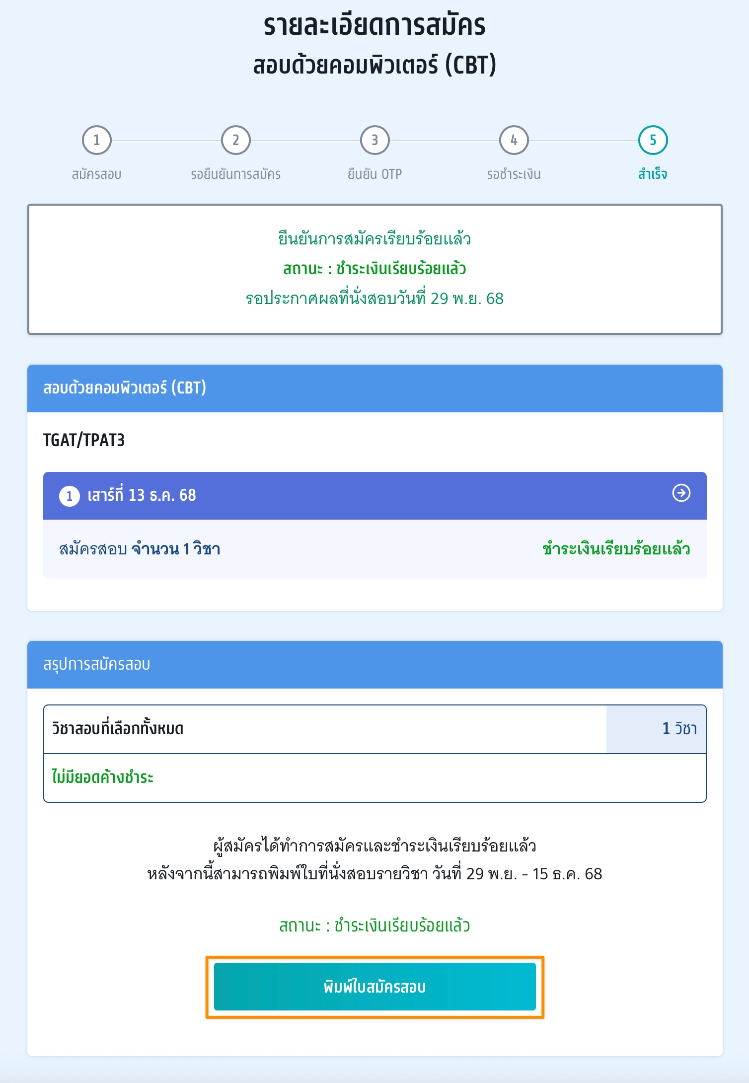 หลังจากชำระเงินเรียบร้อยแล้ว ระบบจะปรากฏสถานะ ชำระเงินเรียบร้อยแล้ว จากนั้นเลือก “พิมพ์ใบสมัครสอบ” เพื่อเก็บไว้เป็นหลักฐานต่อไป