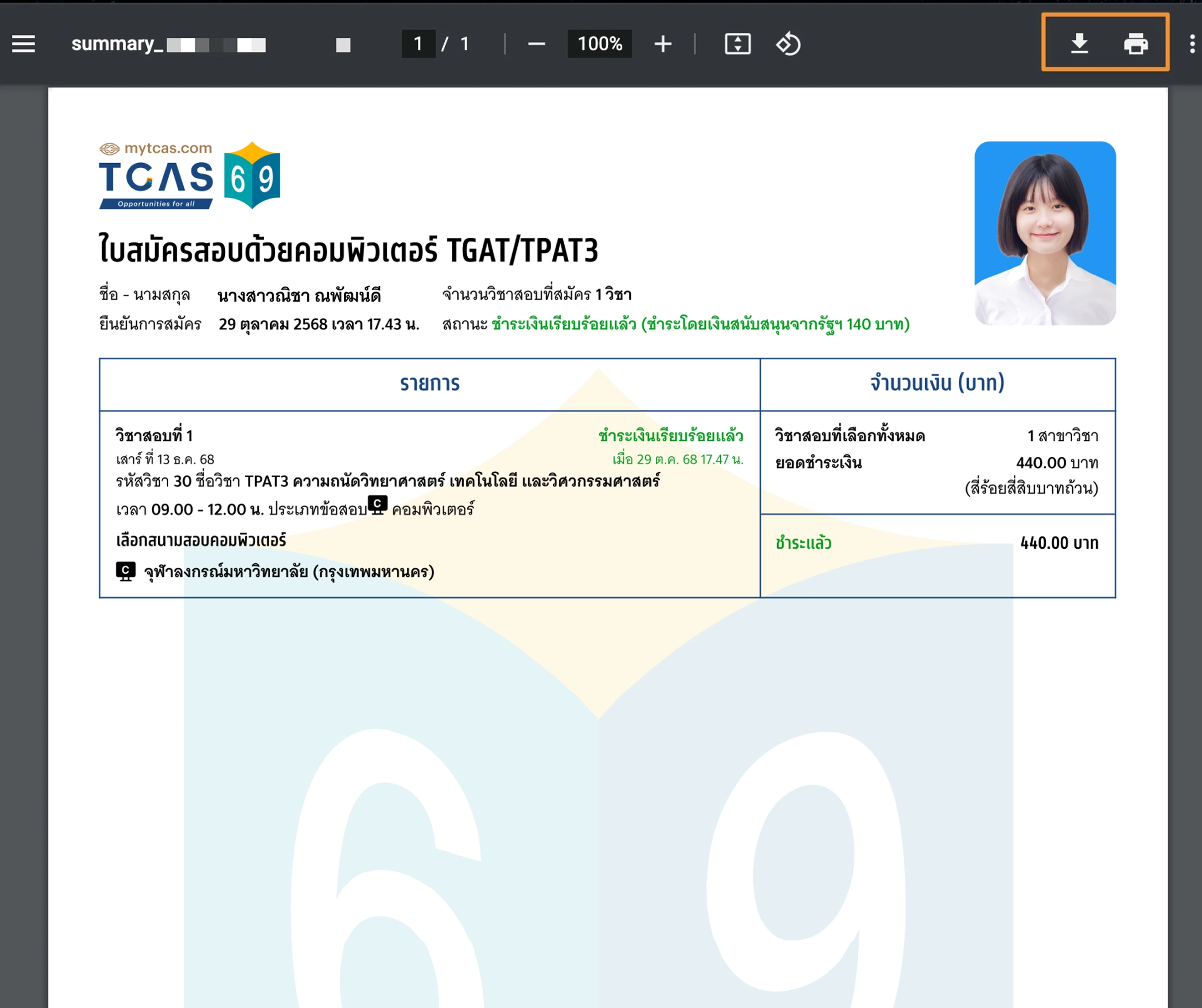เมื่อเลือก “พิมพ์ใบสมัครสอบ” ระบบจะปรากฏไฟล์ใบสมัครสอบ ผู้สมัครสามารถดาวน์โหลดไฟล์ใบสมัครสอบหรือพิมพ์ใบสมัครสอบ เพื่อเก็บไว้เป็นหลักฐานได้จากไอคอนดาวน์โหลดไฟล์หรือไอคอนเครื่องพิมพ์เอกสาร