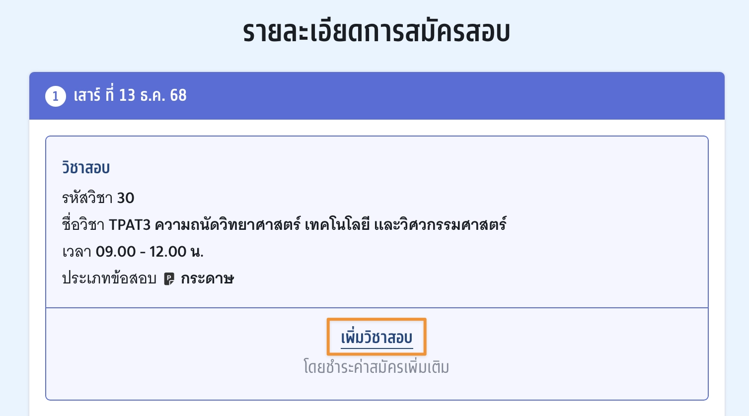 ผู้สมัครสามารถเพิ่มวิชาสอบได้เท่านั้น ไม่สามารถลดวิชาสอบได้ การเพิ่มวิชาสอบจะต้องชำระเงินเพิ่มเติมและทำตามขั้นตอนการสมัครสอบให้ครบถ้วน