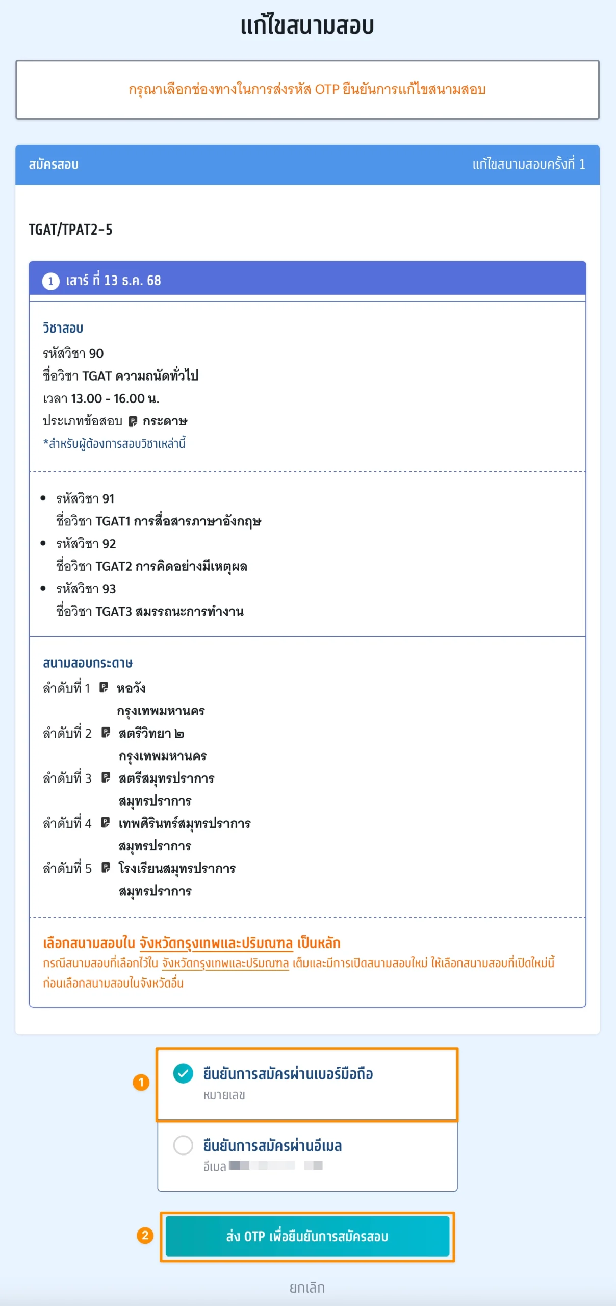 ระบบจะปรากฏช่องทางในการเลือกรับรหัส One Time Password (OTP) เพื่อยืนยันการแก้ไขสนามสอบ จากนั้นเลือก “ส่ง OTP เพื่อยืนยันการสมัครสอบ”