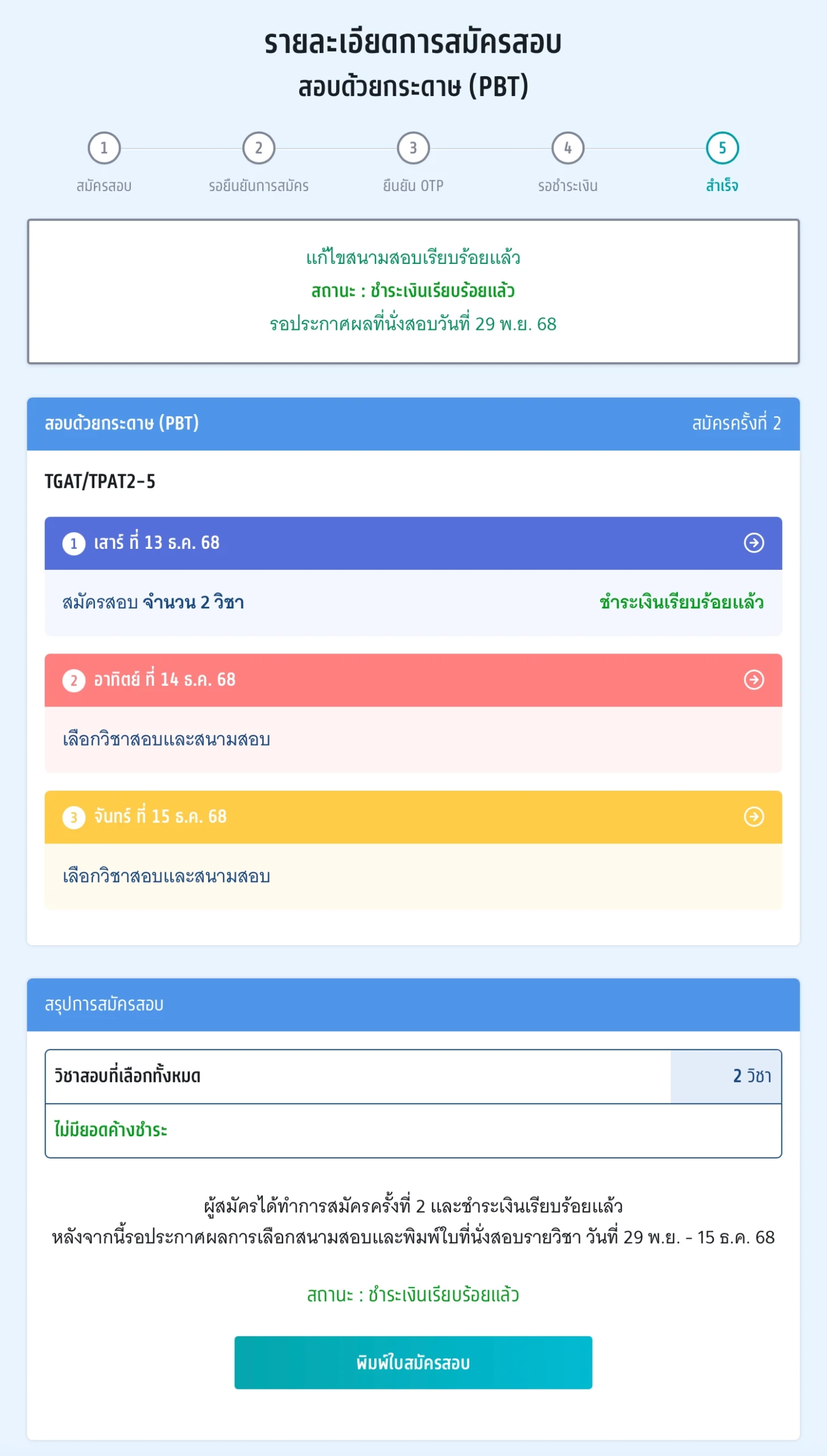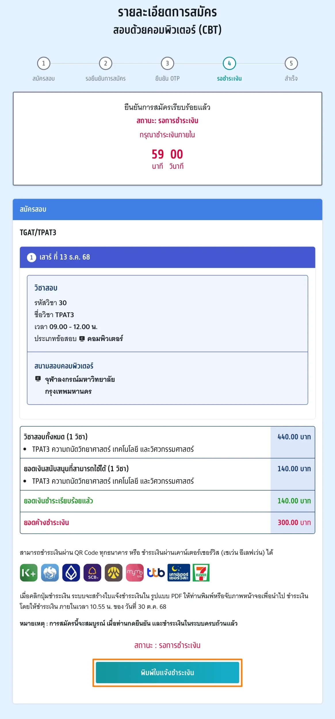 ระบบจะปรากฏสถานะ รอการชำระเงิน รายละเอียดวิชาสอบและสนามสอบทั้งหมด จากนั้นเลือก “พิมพ์ใบแจ้งชำระเงิน” เพื่อชำระเงินในวิชาสอบที่เหลือ (ผู้สมัครจะต้องชำระเงินภายใน 1 ชั่วโมง)