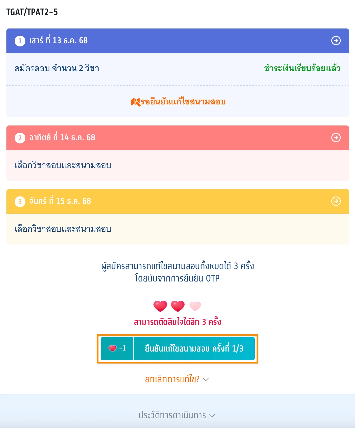 ระบบจะปรากฏสถานะ กรุณายืนยันแก้ไขสนามสอบ โดยผู้สมัครสามารถตัดสินใจได้ 3 ครั้ง จากนั้นเลือก “ยืนยันแก้ไขสนามสอบ”