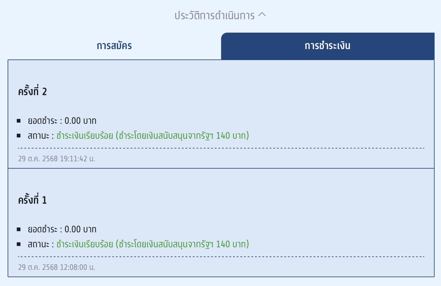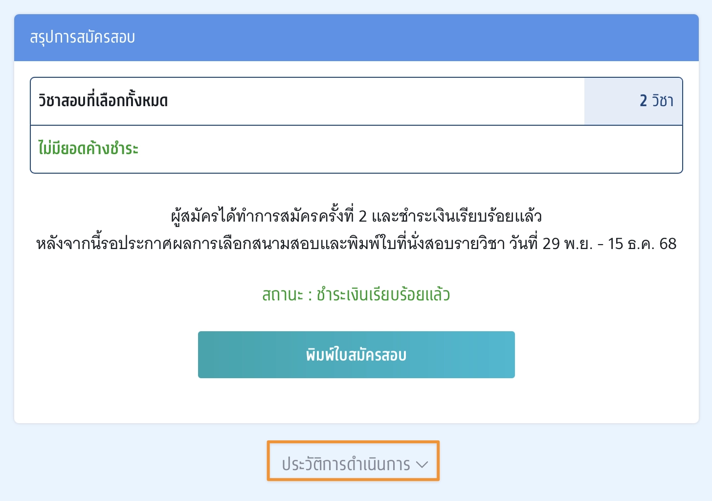 ผู้สมัครสามารถตรวจสอบข้อมูลการสมัครสอบได้ที่ “ประวัติการดำเนินการ”
