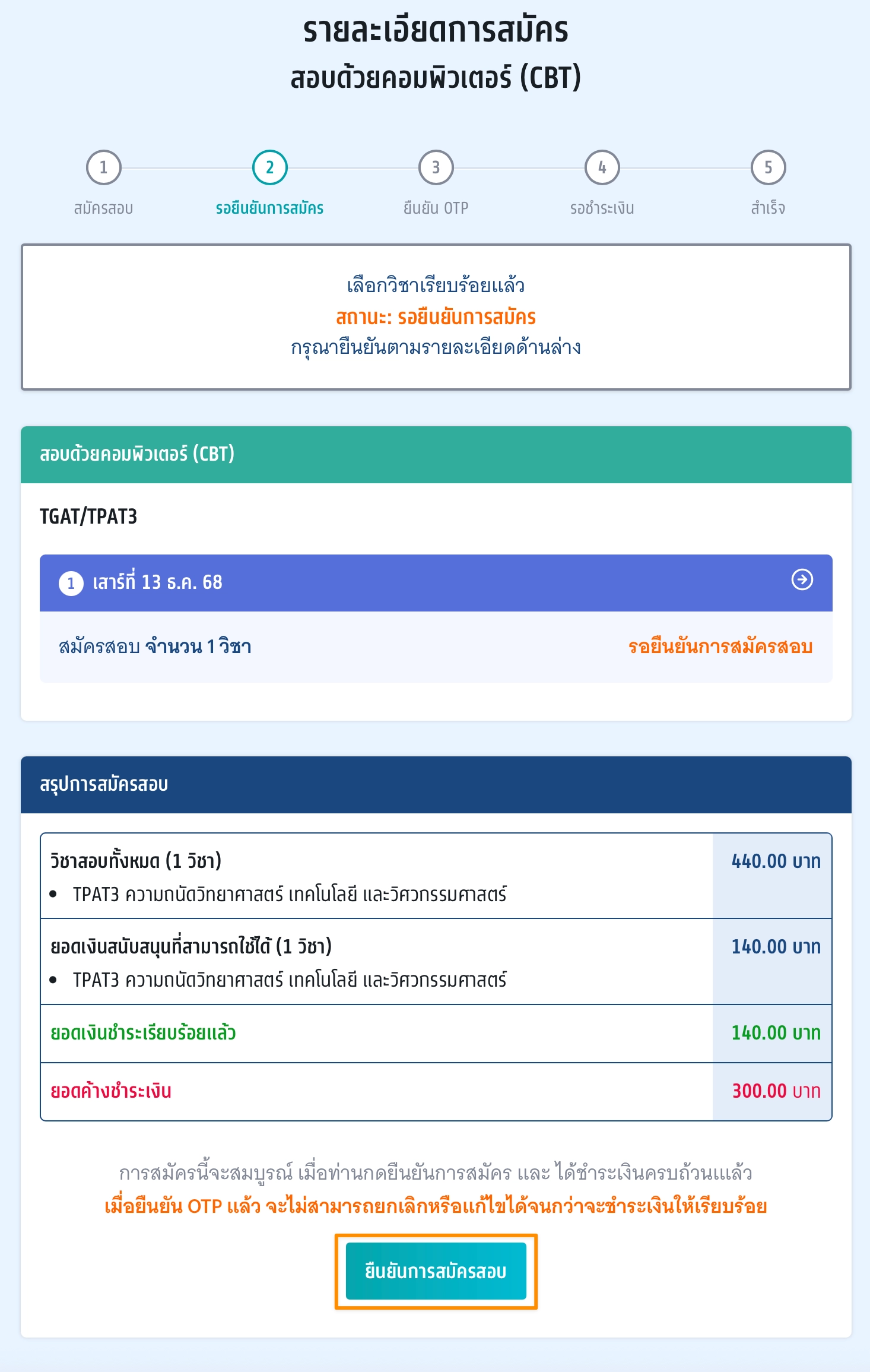 เมื่อบันทึกข้อมูลการเลือกวิชาสอบและสนามสอบเรียบร้อยแล้ว ระบบจะปรากฏสถานะ รอยืนยันการสมัครและสรุปวิชาสอบที่เลือกทั้งหมดและยอดเงินที่ต้องชำระ ให้เลือก “ยืนยันการสมัครสอบ”