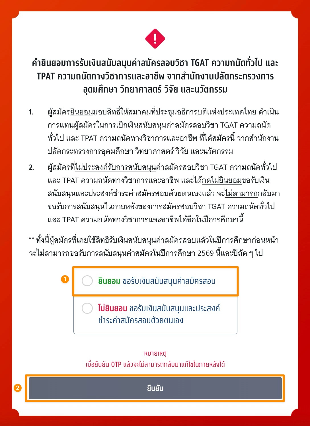 ระบบแสดง คำยินยอมการรับเงินสนับสนุนค่าสมัครสอบวิชา TGAT ความถนัดทั่วไป จากสำนักงานปลัดกระทรวงการอุดมศึกษา วิทยาศาสตร์ วิจัย และนวัตกรรม ผู้สมัครอ่านรายละเอียดให้ครบถ้วน จากนั้นเลือก “ยินยอมขอรับเงินสนับสนุนค่าสมัครสอบ” แล้วเลือก “ยืนยัน”