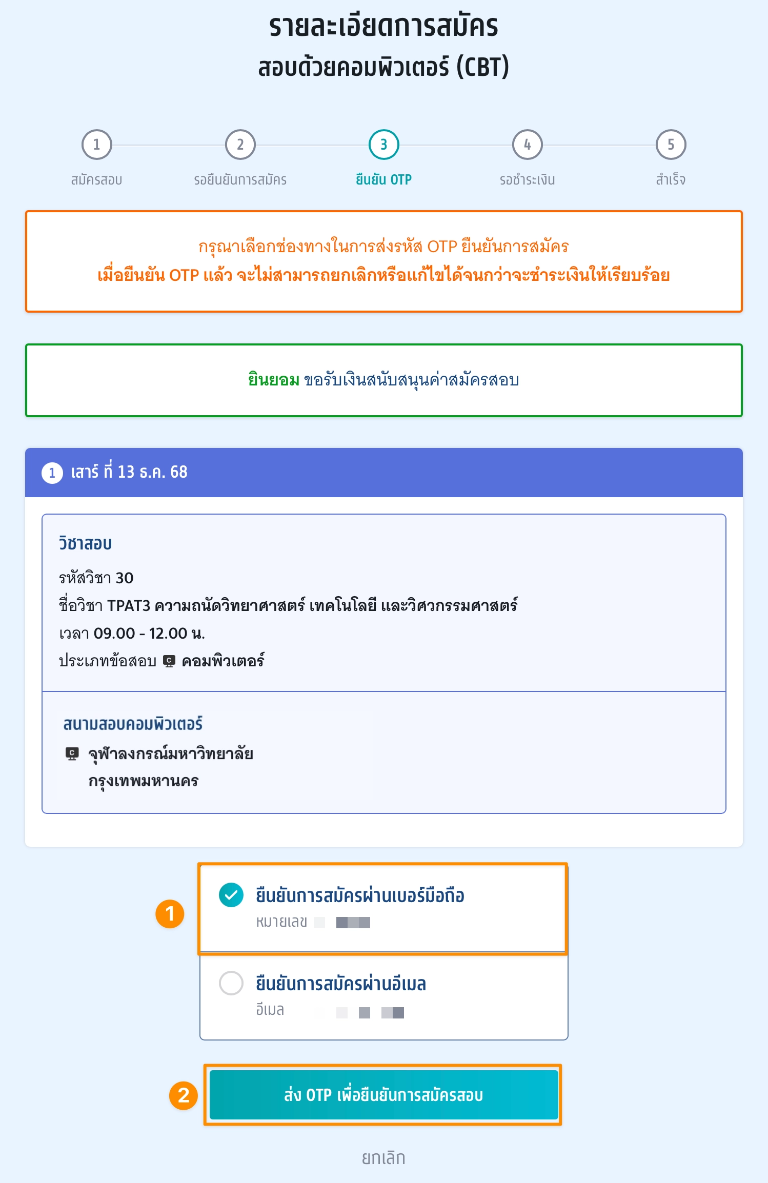 ตรวจสอบความถูกต้องอีกครั้ง และเลือกช่องทางในการส่งรหัส One Time Password (OTP) เพื่อยืนยันการสมัครสอบ จากนั้นเลือก “ส่ง OTP เพื่อยืนยันการสมัครสอบ”