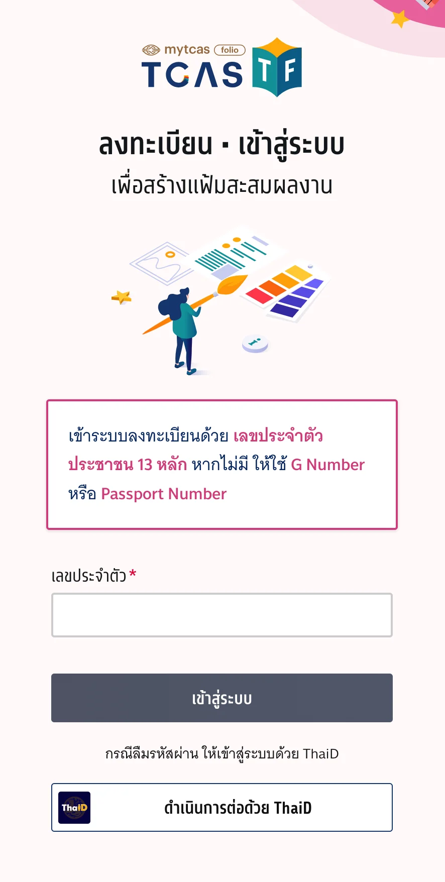 1.การเข้าสู่ระบบ เข้าใช้งานที่ URL https://folio.mytcas.com วิธีลงทะเบียนเข้าสู่ระบบ โดยการใช้เลขประจำตัวประชาชน 13 หลัก / G-Number หรือ Passport Number หรือเลือก “ดำเนินการต่อด้วย ThaiD”