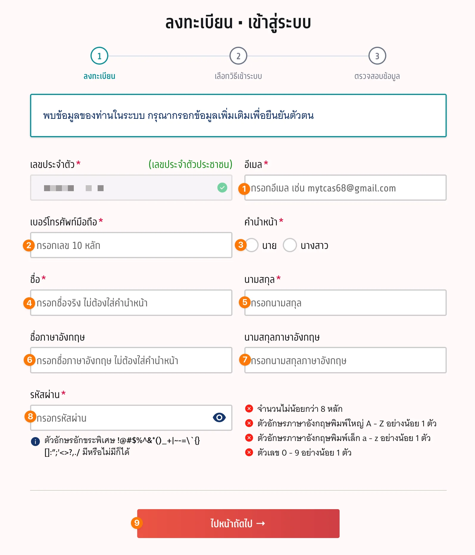 - กำหนดรหัสผ่าน จำนวนไม่น้อยกว่า 8 หลัก ประกอบด้วย