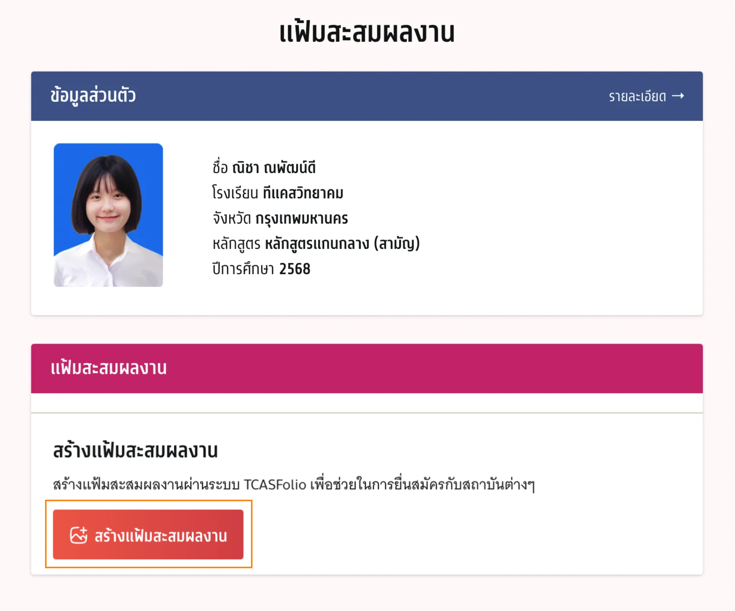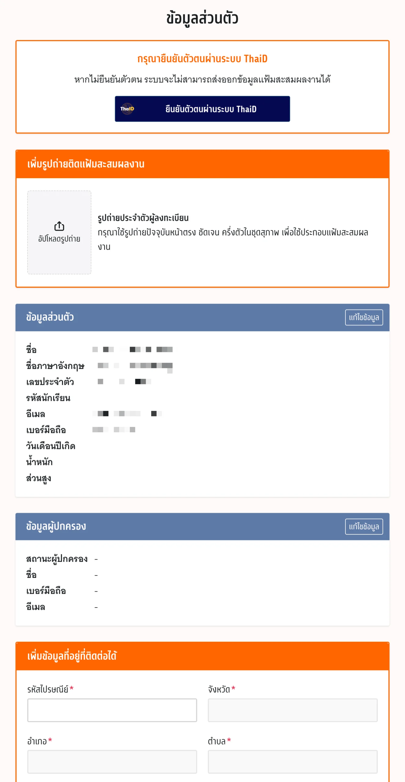 เมื่อเข้าสู่ระบบเรียบร้อยแล้ว ระบบจะปรากฏข้อมูลส่วนตัว ผู้สมัครต้องกรอกข้อมูลในกรอบสีส้มทั้งหมดให้ครบถ้วนจึงจะสามารถสร้างแฟ้มสะสมผลงานได้