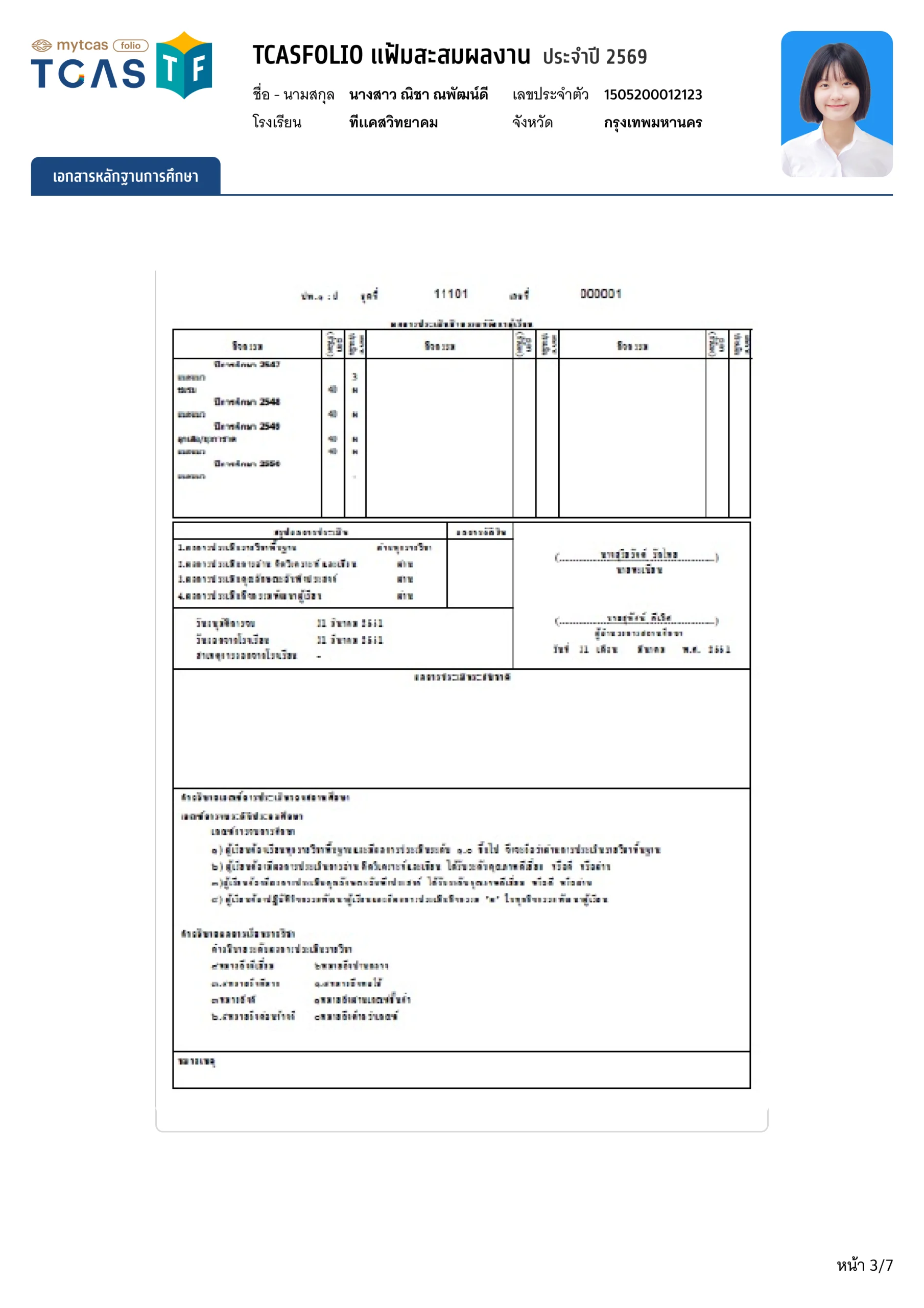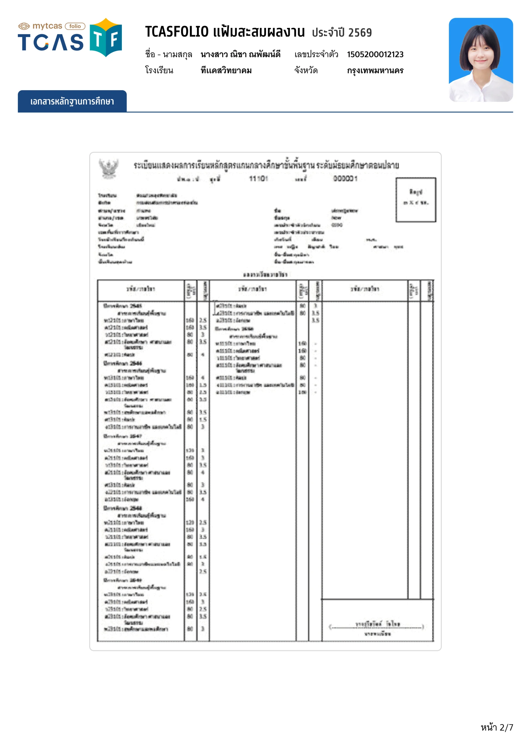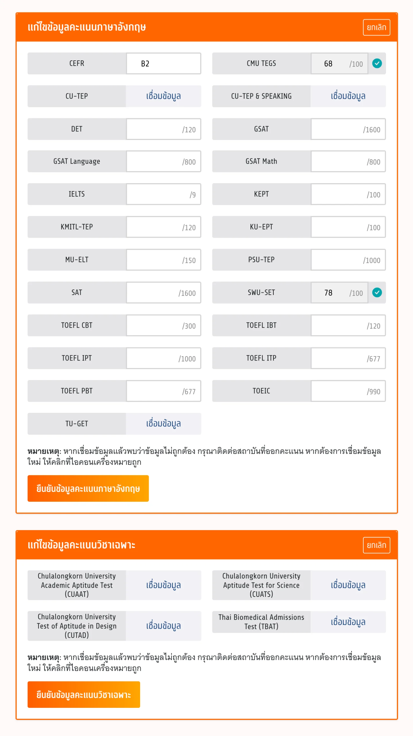ข้อมูลคะแนนที่มีการเชื่อมกับระบบ TCASFolio เมื่อเลือก “เชื่อมข้อมูล” ระบบจะนำคะแนนมาแสดงพร้อมสัญลักษณ์เครื่องหมายถูก เพื่อเป็นการยืนยันว่าคะแนนชุดนี้ถูกต้อง และได้รับการยืนยันจากสถาบันที่ออกคะแนน
