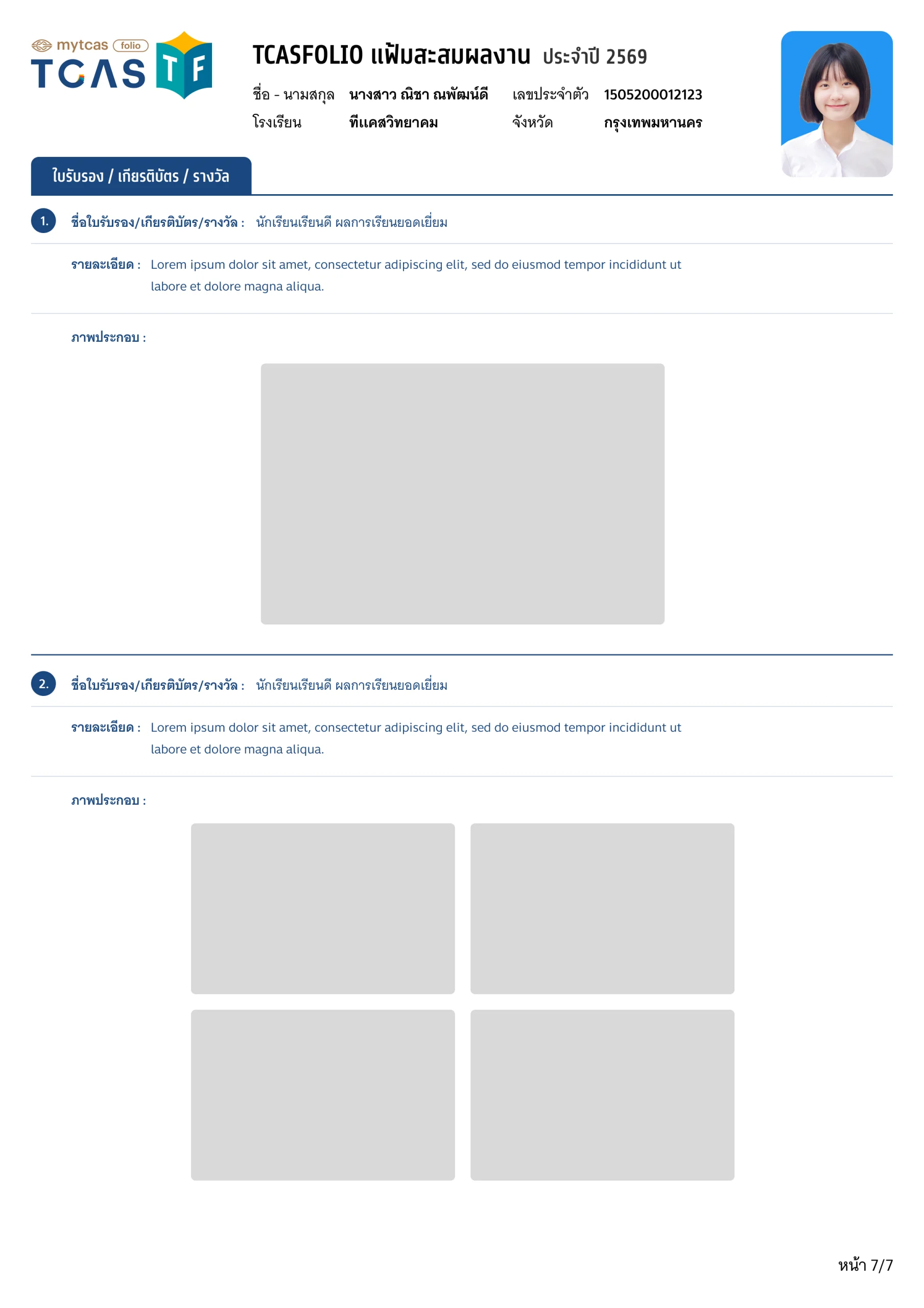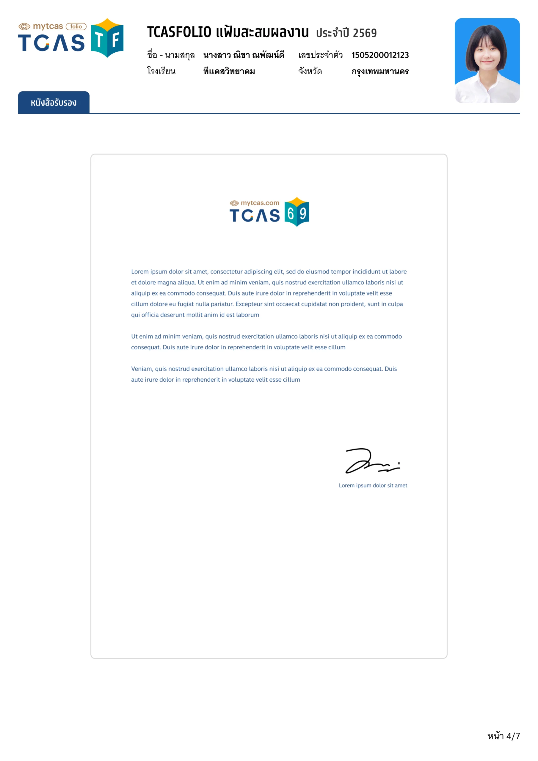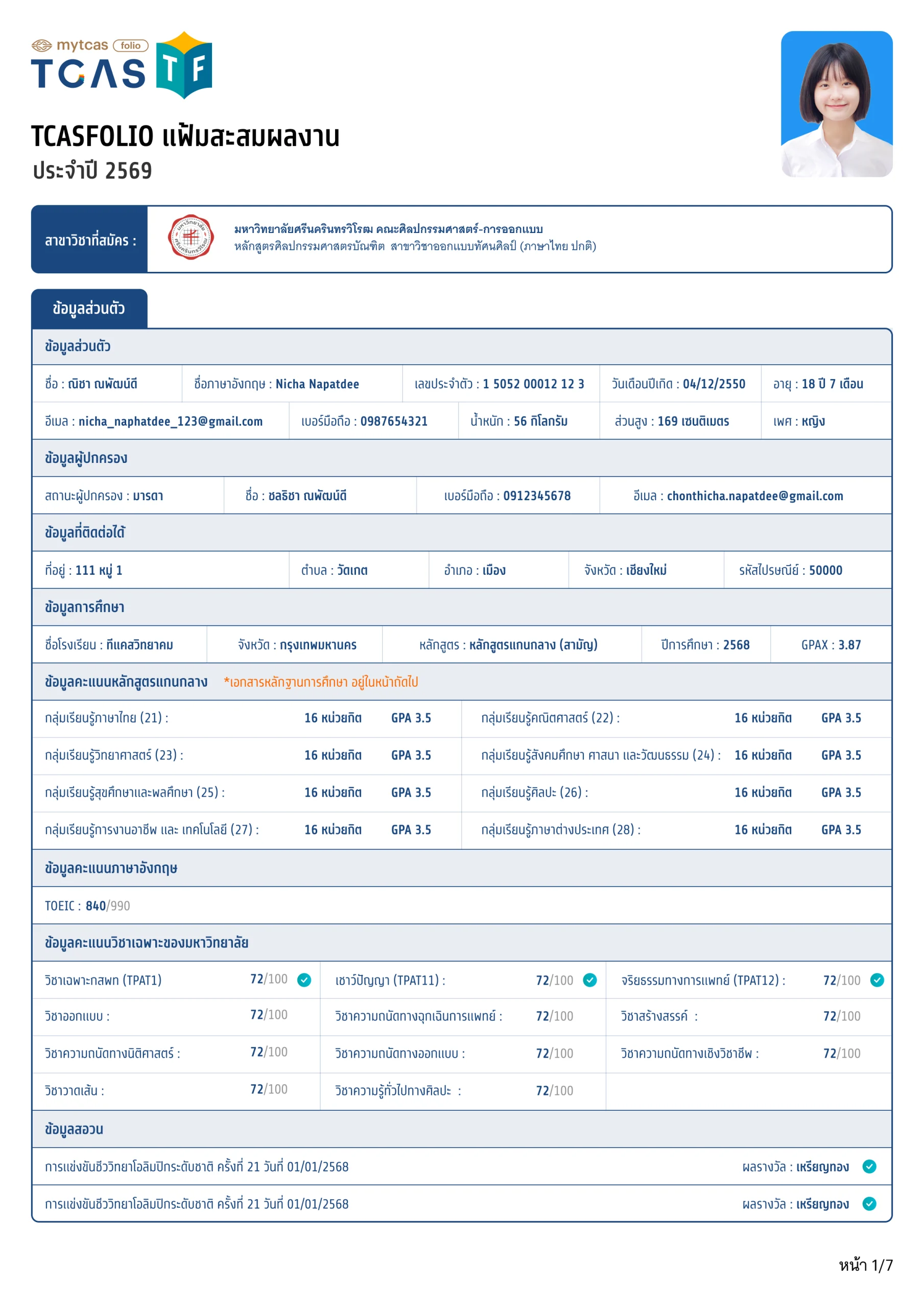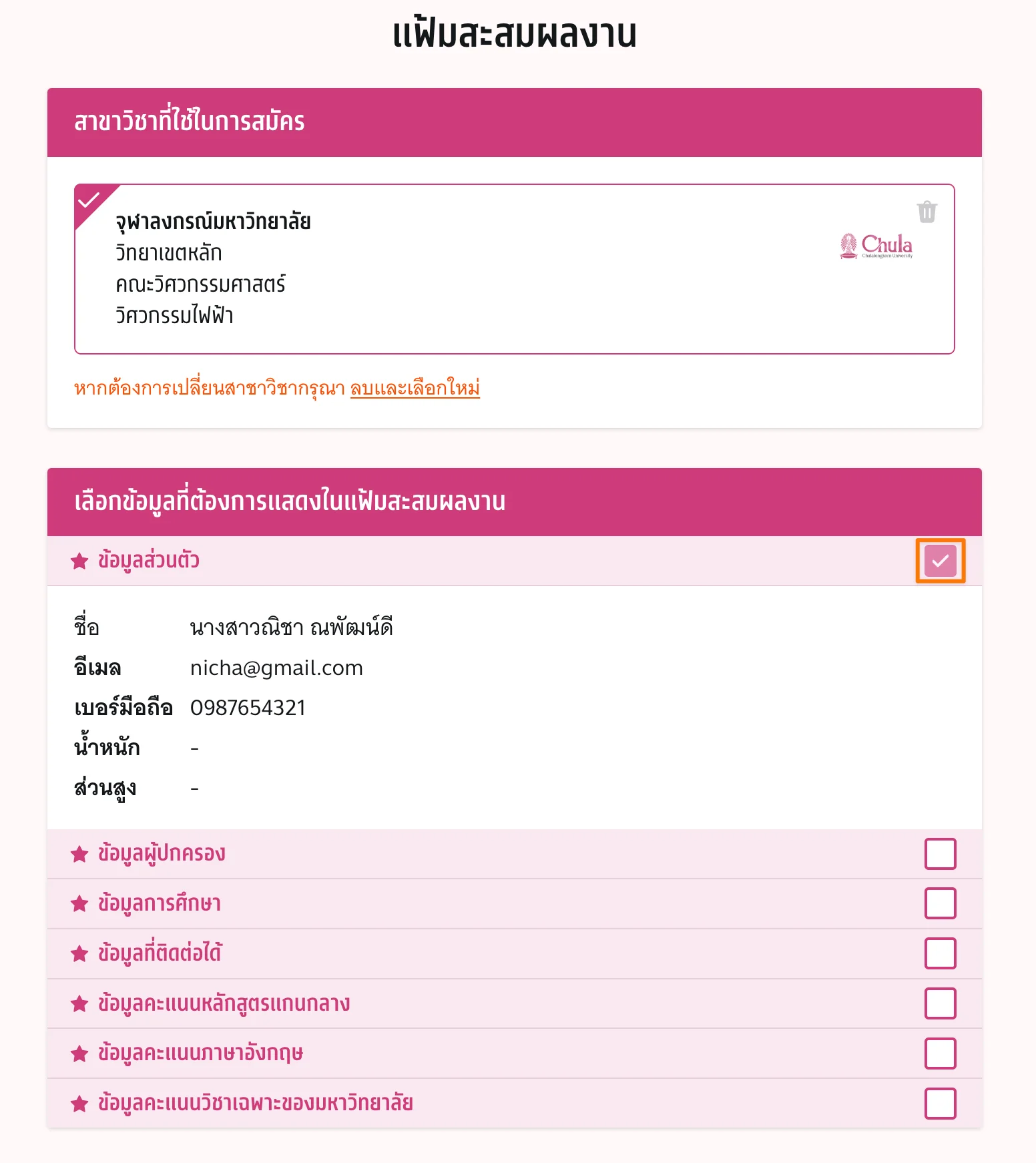 ผู้สมัครสามารถเลือกข้อมูลที่ต้องการแสดงในแฟ้มสะสมผลงานได้ ทั้งข้อมูลส่วนตัว และข้อมูลคะแนนต่างๆ