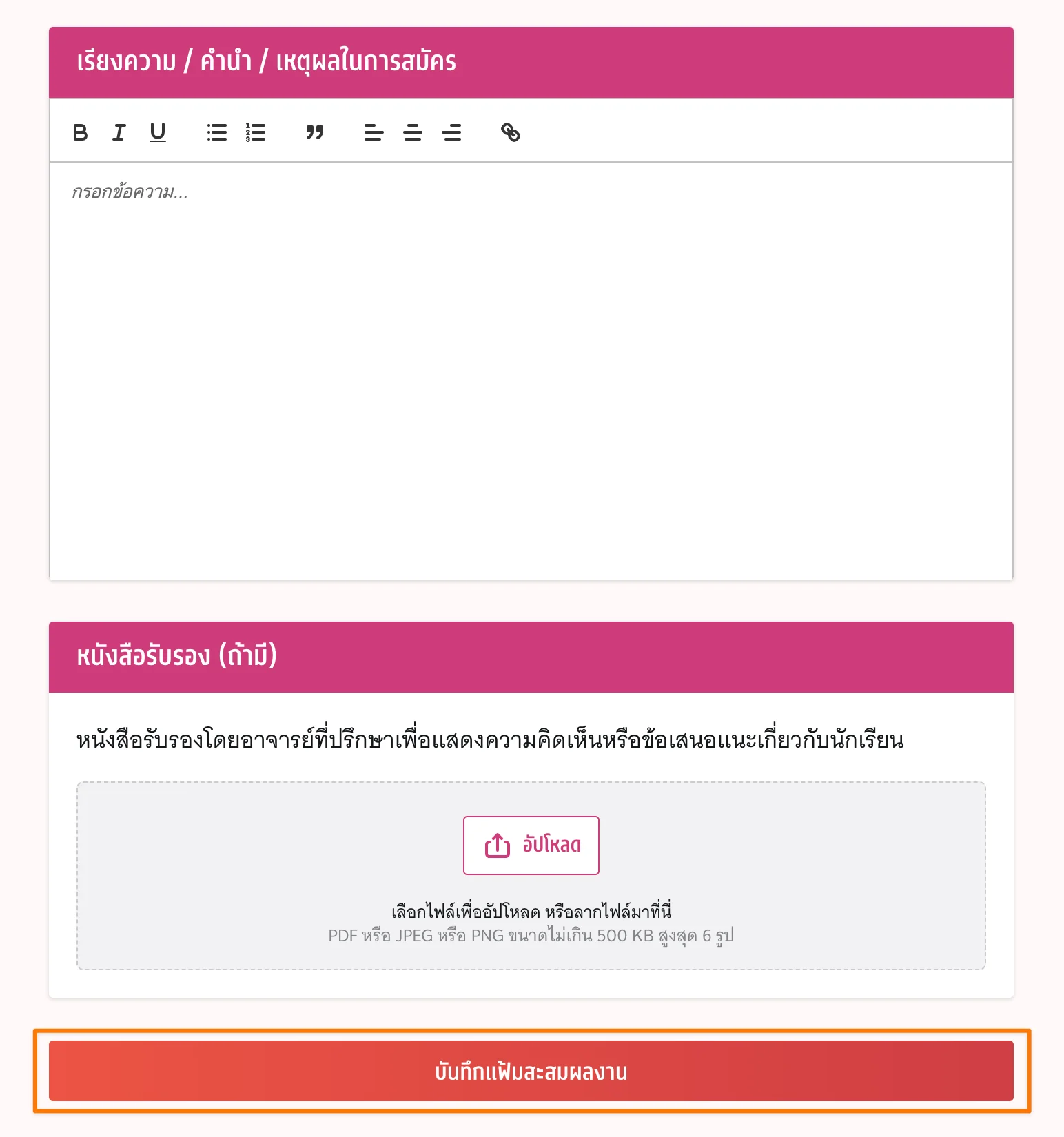 เมื่อกรอกข้อมูลเรียบร้อยแล้ว เลือก “บันทึกแฟ้มสะสมผลงาน”