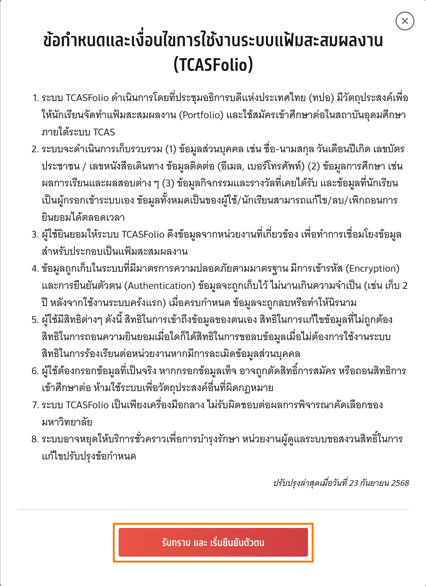 ระบบแสดง ข้อกำหนดและเงื่อนไขในการใช้งานระบบ TCASFolio ผู้สมัครอ่านทำความเข้าใจแล้วเลือก “รับทราบ”