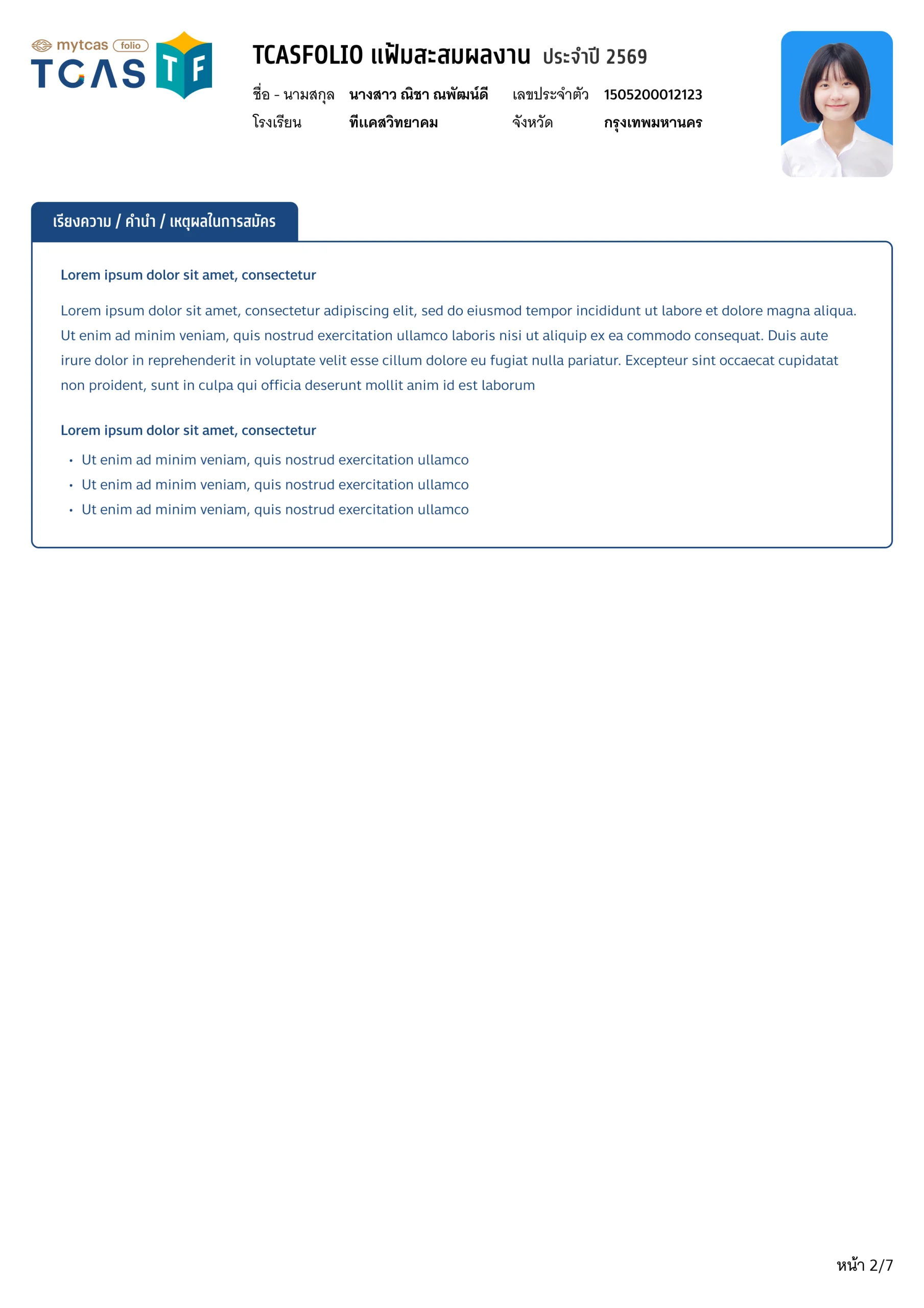 • เรียงความ / คำนำ / เหตุผลในการสมัคร